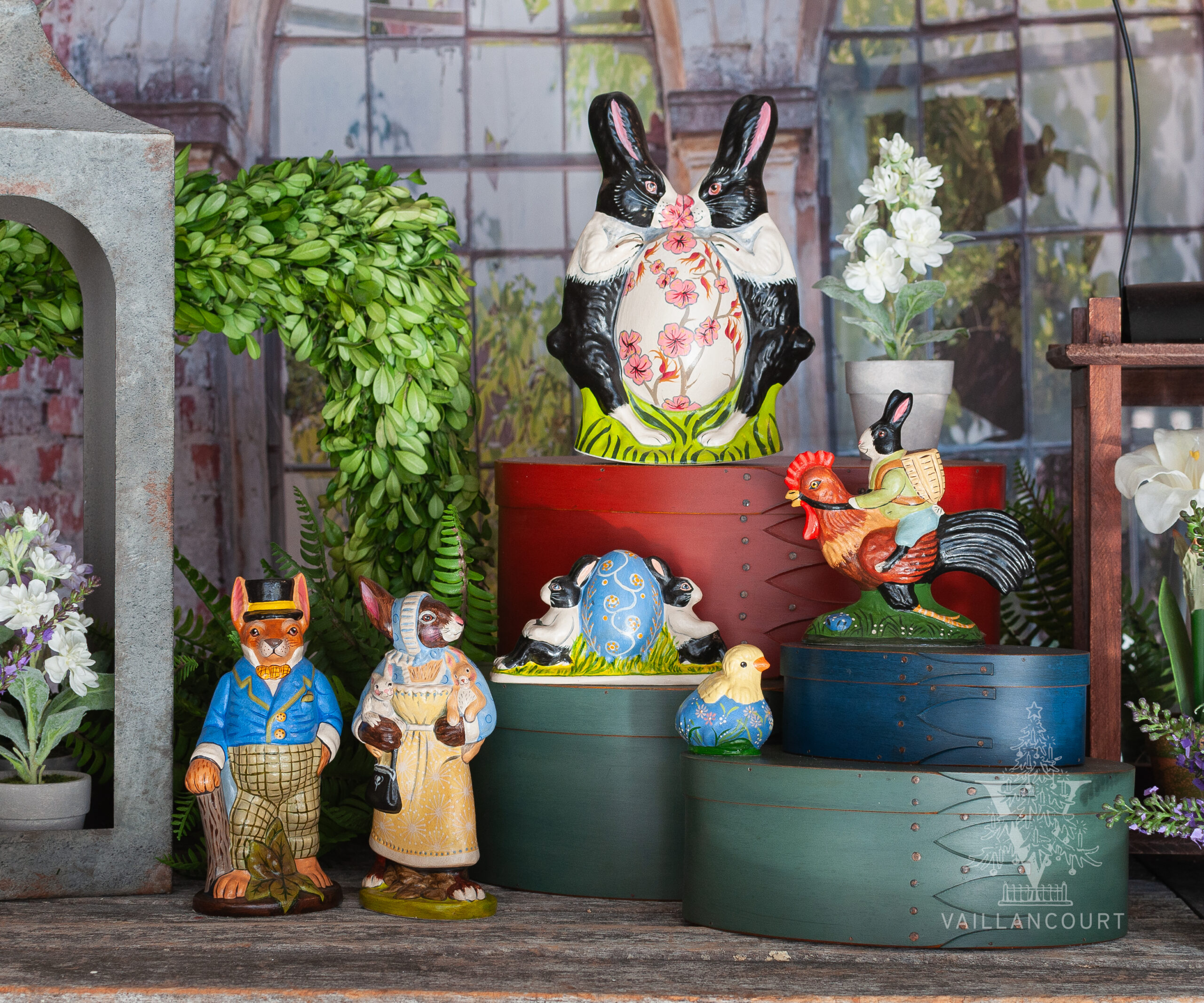 Spring’s arrival brings with it the promise of warmer days, blooming flowers, and the playful energy of bunnies in the garden. At Vaillancourt Folk Art, our Chalkware Rabbits perfectly capture this seasonal charm, each hand-painted with the same fine art detail as our cherished Chalkware Santas. From the dapper “Male Rabbit in Top Hat” to the whimsical “Rocking Rabbits with Floral Egg,” our collection embodies the timeless traditions of spring. Every piece is crafted with care in our Sutton, Massachusetts studio, offering collectors a beautiful way to celebrate the season’s renewal.