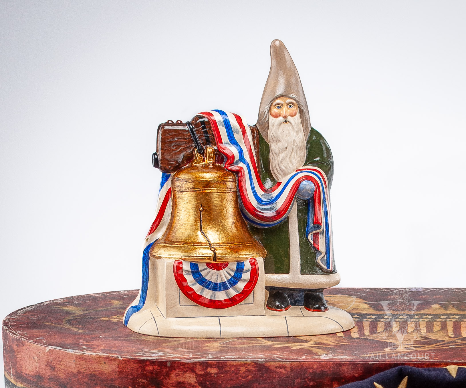 Celebrate America’s 250th with the Liberty Bell Santa — a hand-painted symbol of freedom and craftsmanship. Cloaked in forest green beside a gilded Liberty Bell draped in patriotic bunting, this American-made chalkware Santa honors both our nation’s heritage and the enduring artistry of Vaillancourt Folk Art.