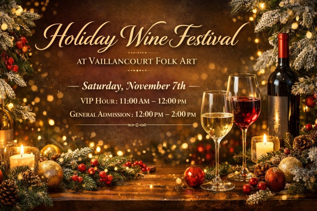 Vaillancourt Folk Art will host its inaugural Holiday Wine Festival on Saturday, November 7—a curated 21+ wine tasting experience designed to help guests select the perfect wines for Thanksgiving dinners, Christmas parties, and holiday host gifts. Tailored to the interests of the Vaillancourt Collector, the festival will partner exclusively with Ruby Wines to present a diverse portfolio that aligns with the tastes and expectations of this audience.