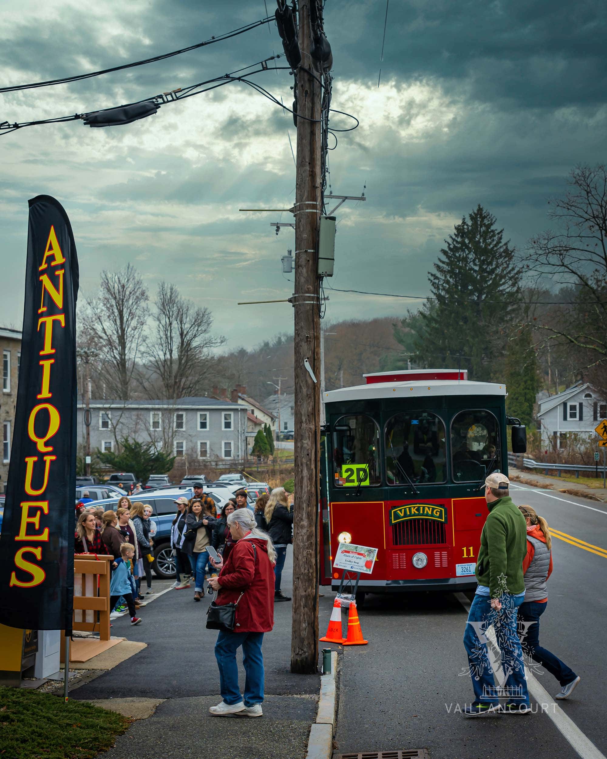 In 1992, Gary Vaillancourt worked with the Worcester County Convention & Visitors Bureau (WCCVB) to create the “Chain of Lights” which was a multi-town program where local businesses would coordinate efforts to promote their services. Each event would feature a special lighting ceremony which would link all of Central Massachusetts  as a “Chain of Lights.” During its 1992 kick off, it stretched as far north as Westminster Village Inn and extended through Worcester and Sturbridge Counties. The town of Sutton’s original participation was called the “Christmas Tasting In Sutton” where business leaders from Vaillancourt Folk Art, Pleasant Valley Country Club, Eaton’s Candy, and Known Orchards would pool their resources to rent a trolley that would travel between each business. At Vaillancourt Folk Art, the inaugural year corresponded with the Starlight Foundation fundraiser through the sale of the highly sought-after Starlight Santa. The first “Wassail Tasting” included a meet-and-greet with Tom Bergeron, then of WBZ-TV. As part of the WCCVB’s commitment to the program, the night would conclude with a town-wide celebration at the Common as the Christmas lights are turned on. Since then, many towns throughout Worcester Country has ceased their coordinated celebrations when the WCCVB discontinued the program. Sutton, however, continues to celebrate this event as their own having formed a local committee made up of volunteers, business owners and organizations, giving up countless hours in order to support this town-wide event for the next generation. Since the first year in 1992 with only one trolley and four stops, today there are several trollies among multiple routes, connecting a dozen town business forming a “Chain of Lights” in Sutton.