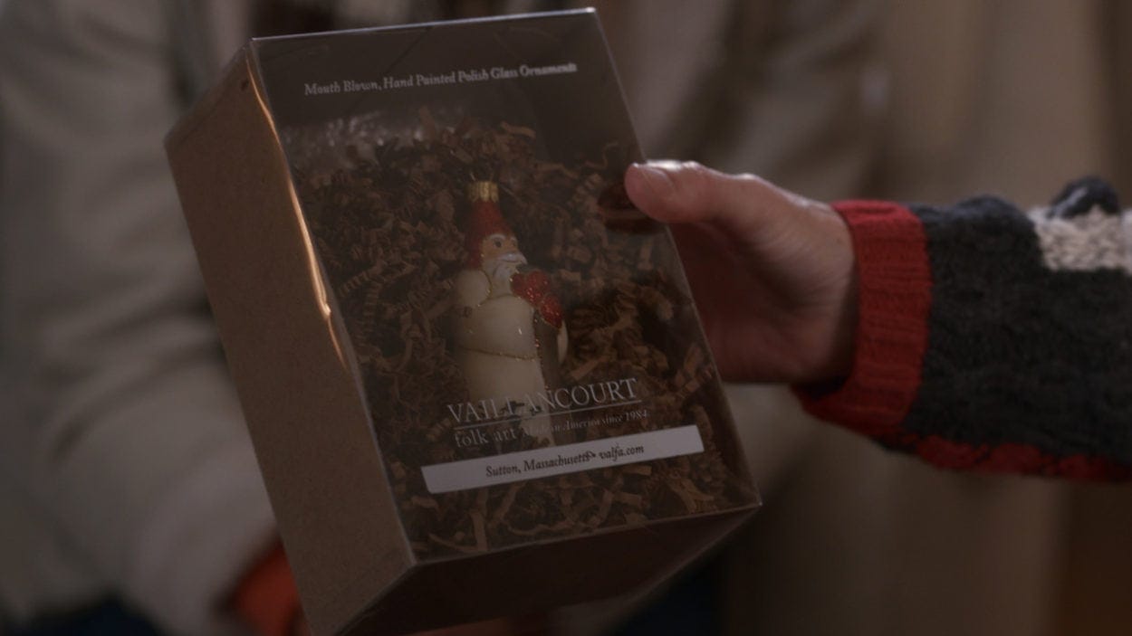 Filled with regional brands and companies, like Polar, BayState Savings Bank, Robbie’s Place, and Whittier Farms, we’re thrilled to see that they used two of our ornaments—Santa on Rocking Horse Ornament and 9th Day of Christmas Glimmer Ornament—and our 29th Starlight Santa: Blue First Snowfall Chalkware Santa—in several scenes.