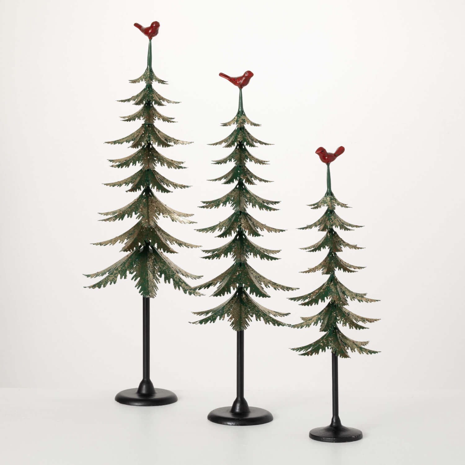 Cardinal-Topped Metal Pine Trees (Set of 3)