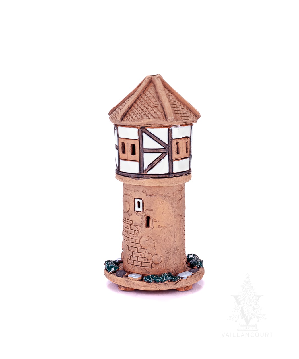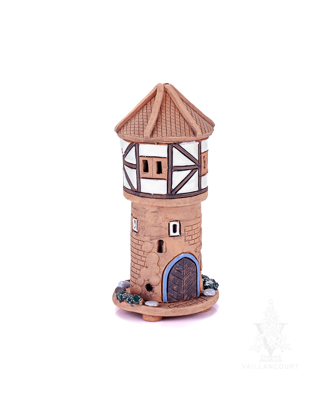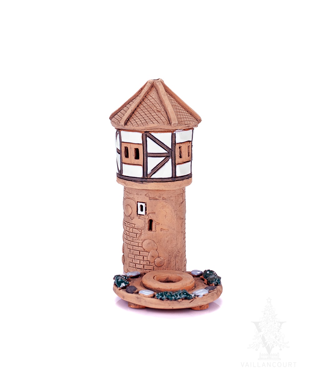This ceramic building is intended to be used with coned incense or tealights so the smoke can be seen coming from the chimney. Handmade for Vaillancourt.