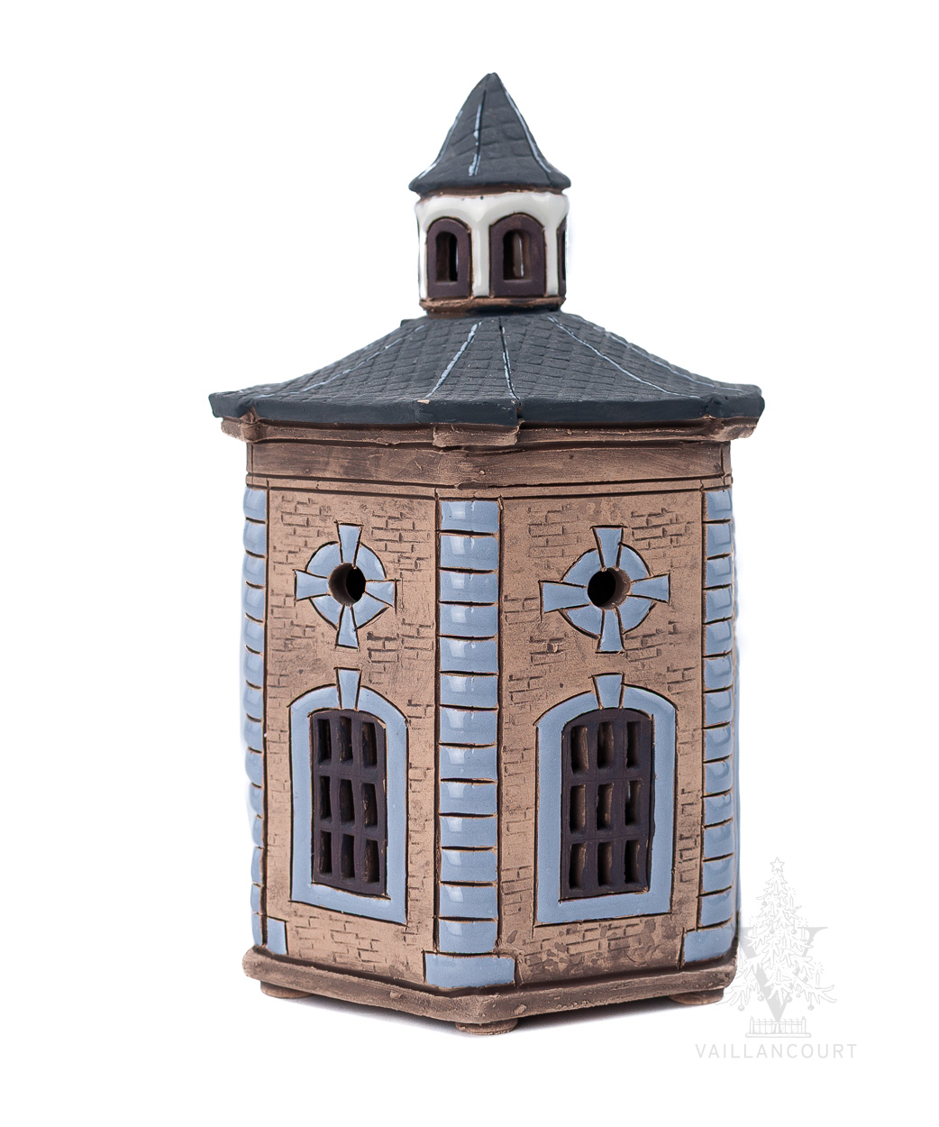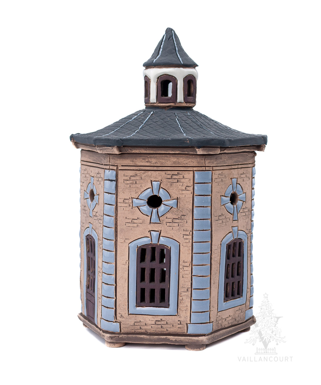 This ceramic building is intended to be used with coned incense or tealights so the smoke can be seen coming from the chimney. Handmade for Vaillancourt.