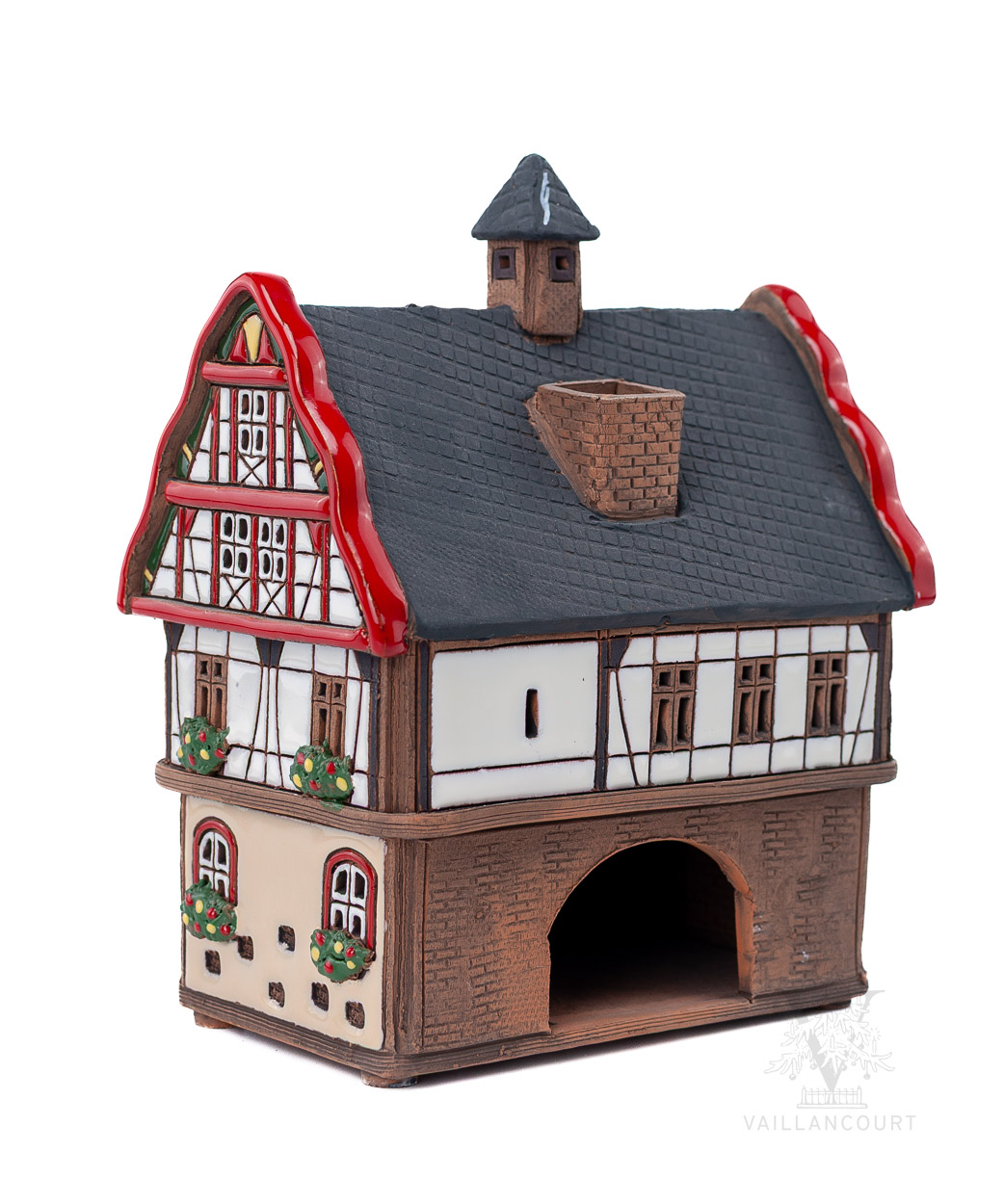 This ceramic building is intended to be used with coned incense or tealights so the smoke can be seen coming from the chimney. Handmade for Vaillancourt.