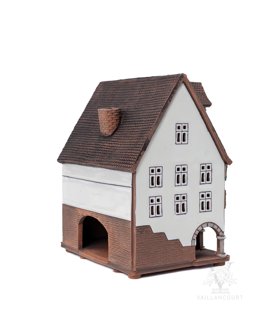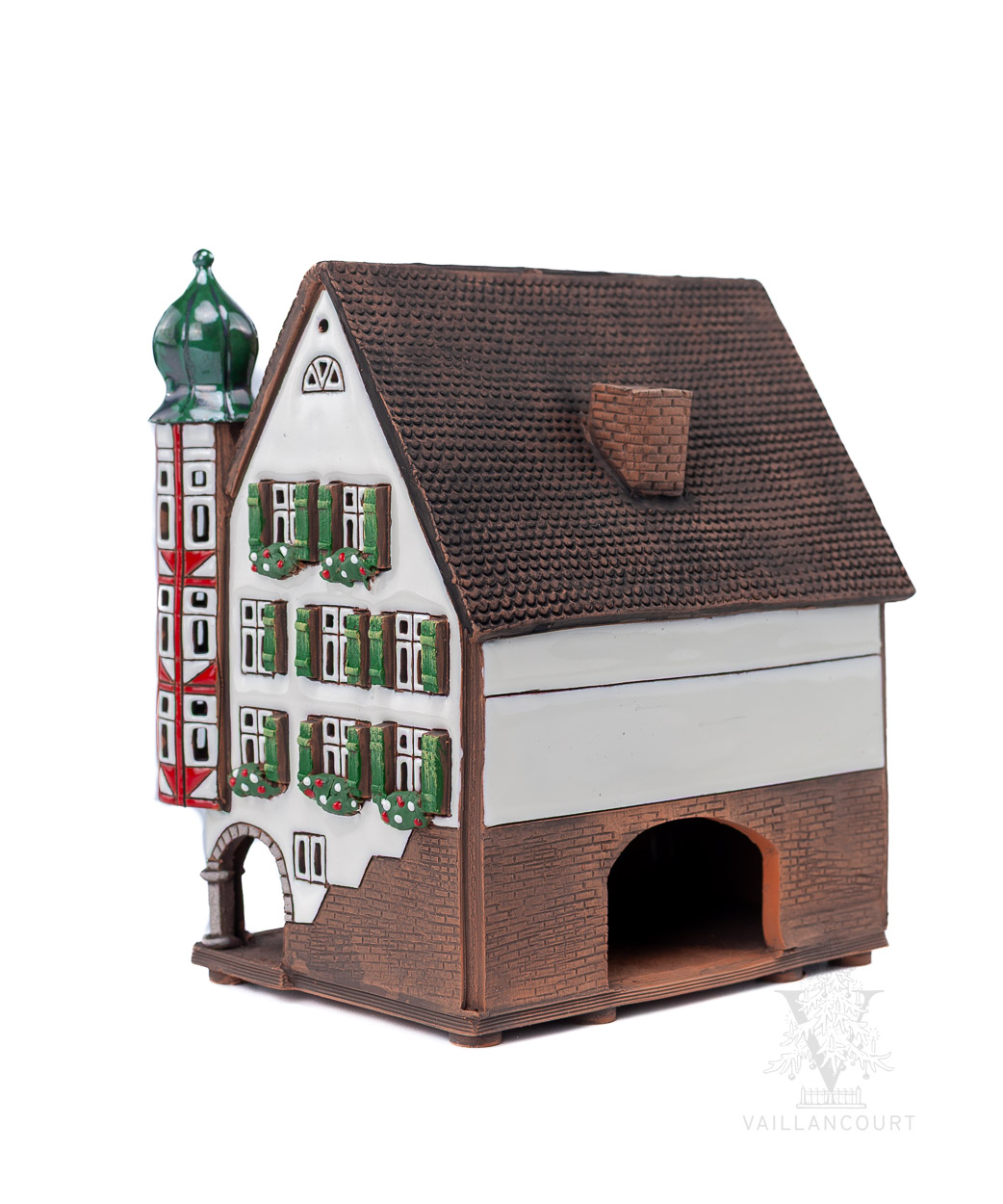 This ceramic building is intended to be used with coned incense or tealights so the smoke can be seen coming from the chimney. Handmade for Vaillancourt.