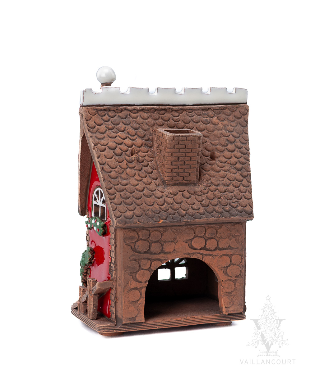 This ceramic building is intended to be used with coned incense or tealights so the smoke can be seen coming from the chimney. Handmade for Vaillancourt.