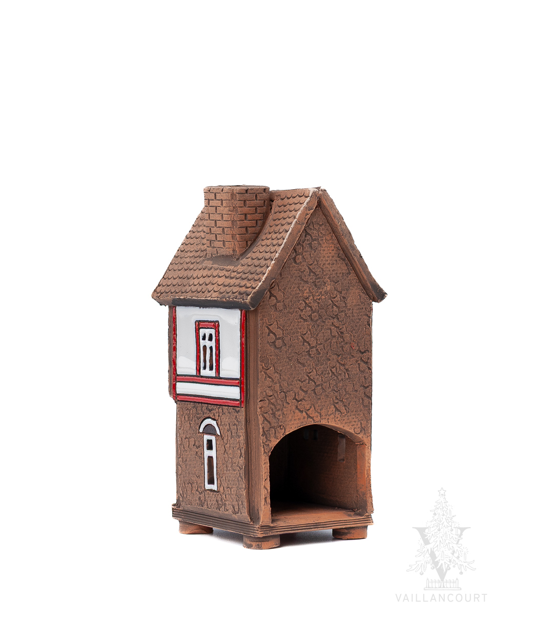 This ceramic building is intended to be used with coned incense or tealights so the smoke can be seen coming from the chimney. Handmade for Vaillancourt.
