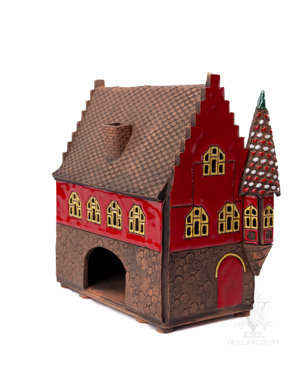 This ceramic building is intended to be used with coned incense or tealights so the smoke can be seen coming from the chimney. Handmade for Vaillancourt.