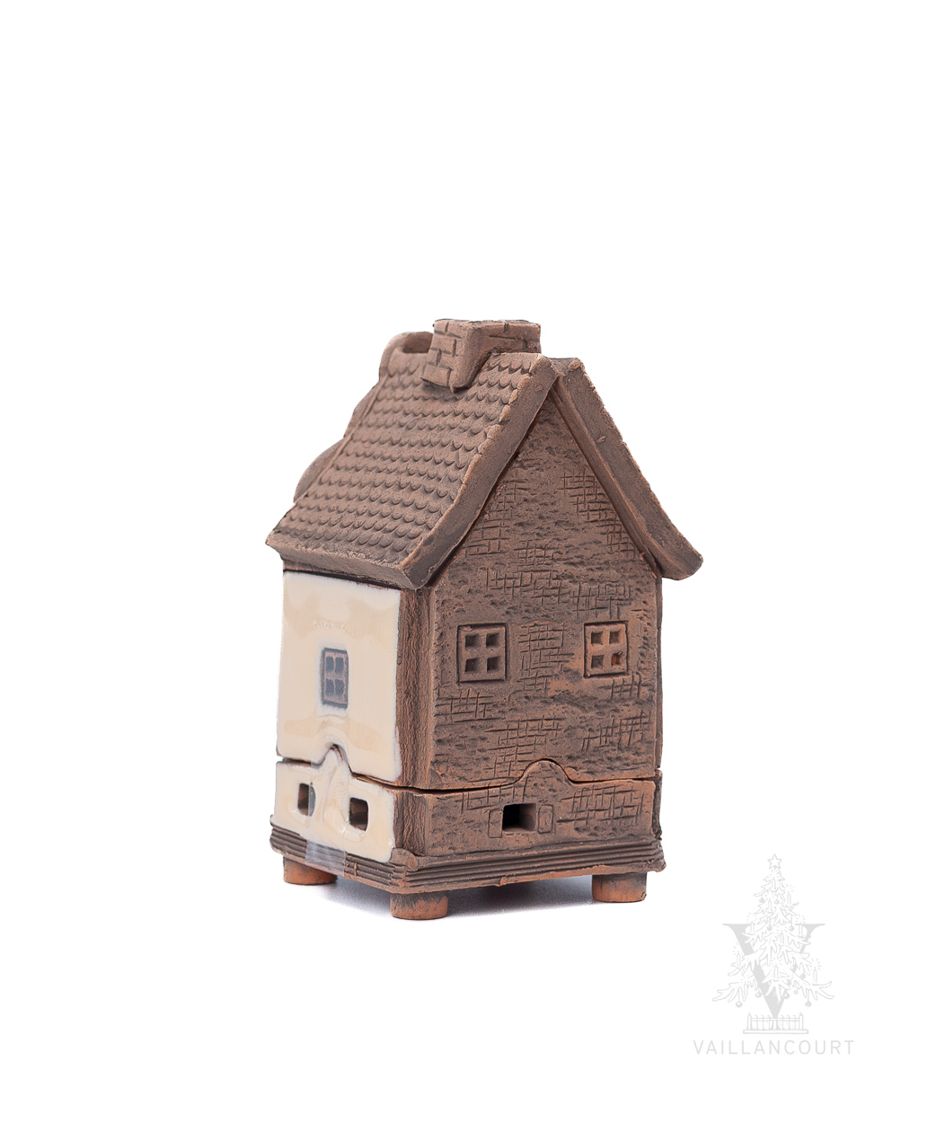 This ceramic building is intended to be used with coned incense or tealights so the smoke can be seen coming from the chimney. Handmade for Vaillancourt.
