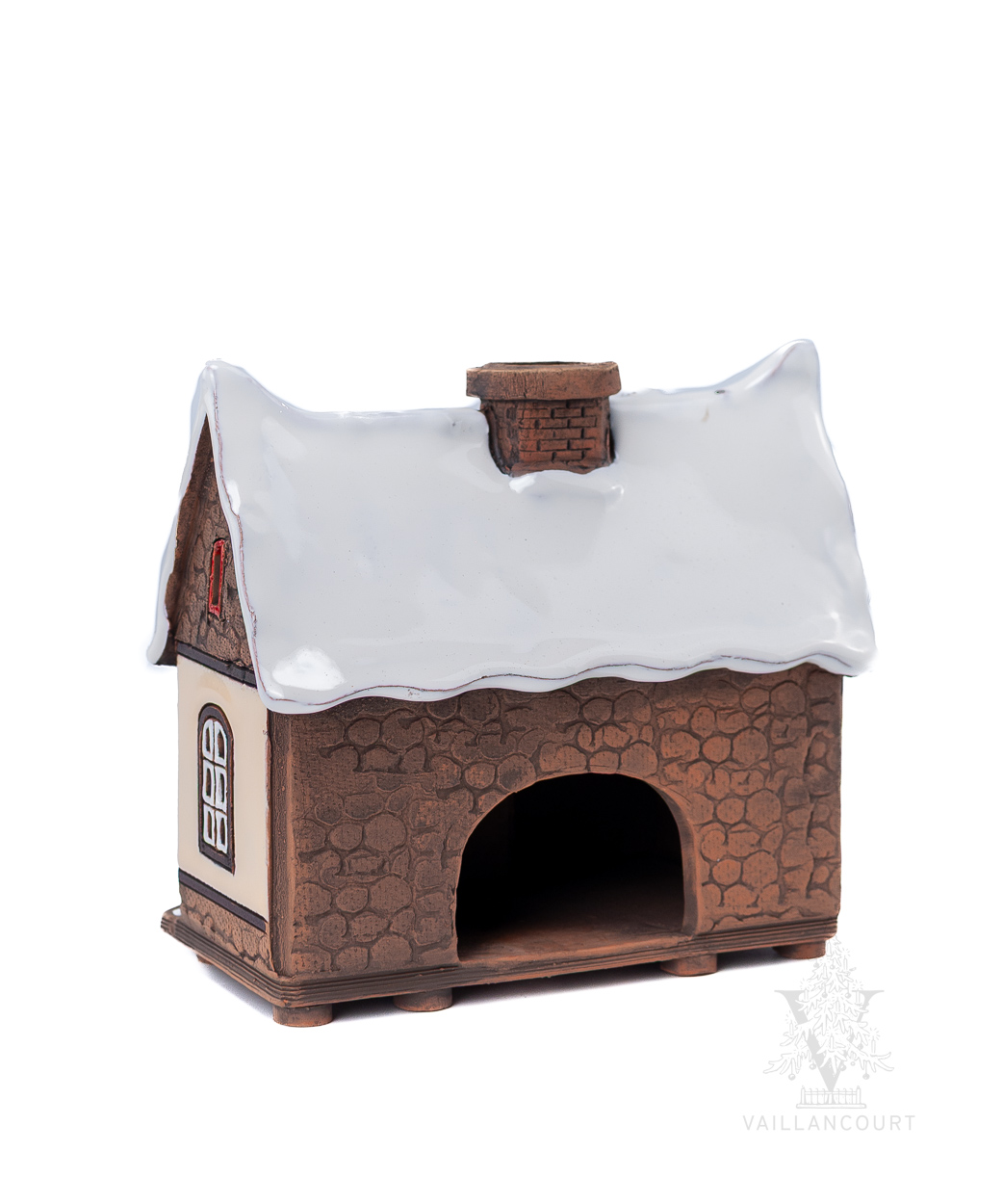 This ceramic building is intended to be used with coned incense or tealights so the smoke can be seen coming from the chimney. Handmade for Vaillancourt.