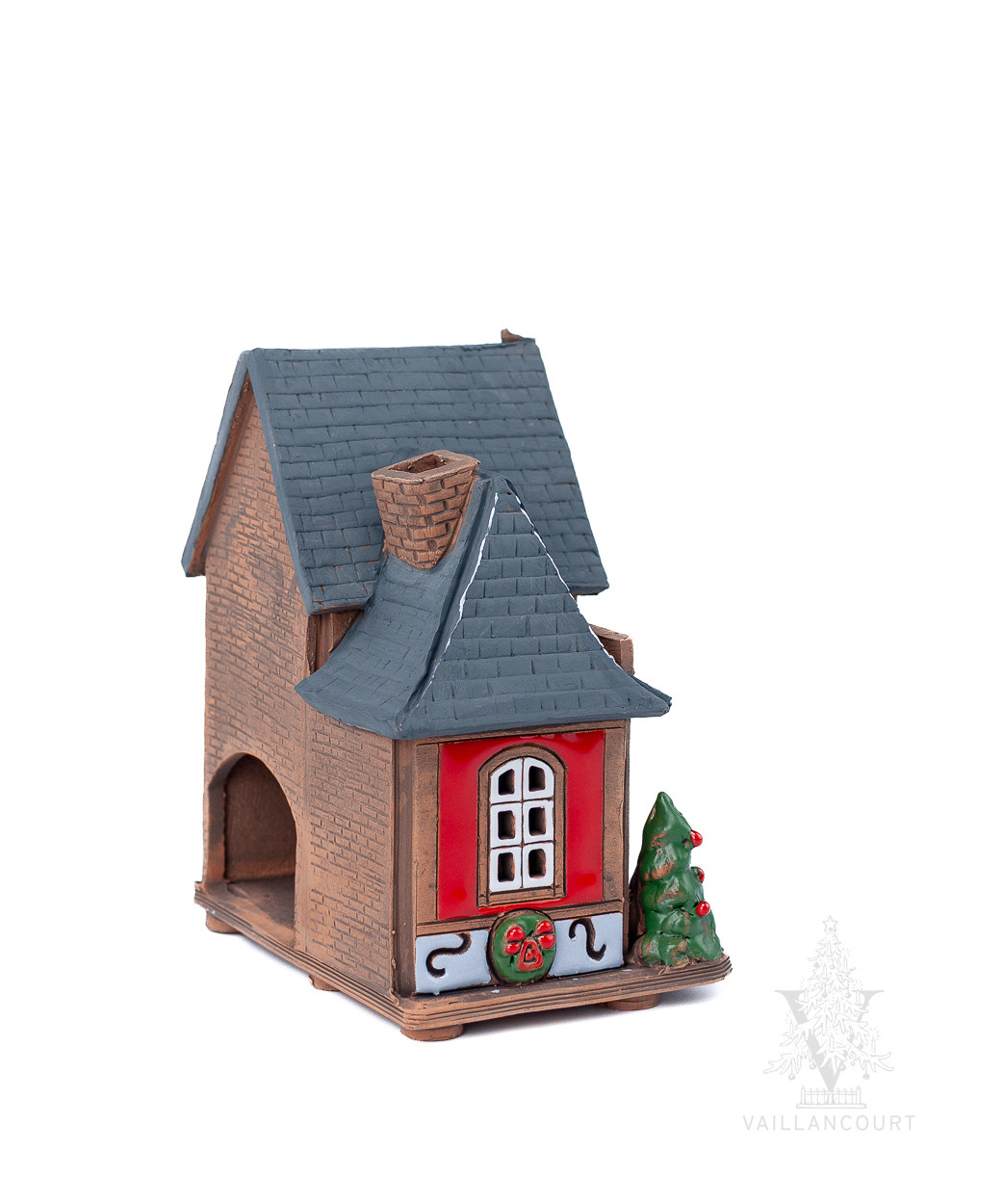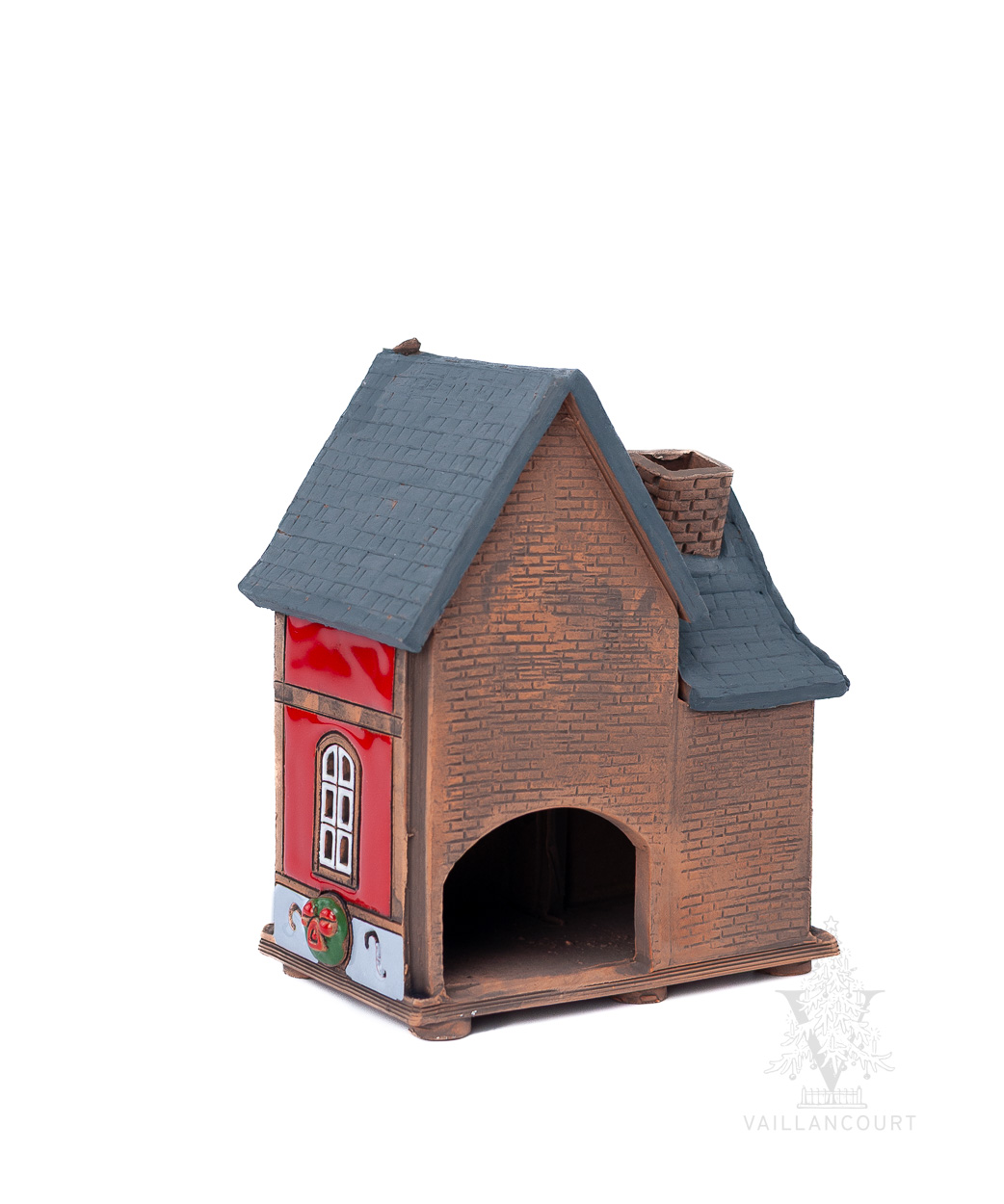 This ceramic building is intended to be used with coned incense or tealights so the smoke can be seen coming from the chimney. Handmade for Vaillancourt.