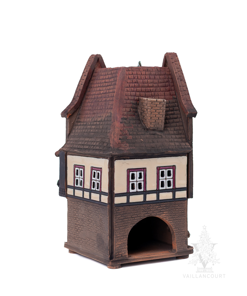 This ceramic building is intended to be used with coned incense or tealights so the smoke can be seen coming from the chimney. Handmade for Vaillancourt.
