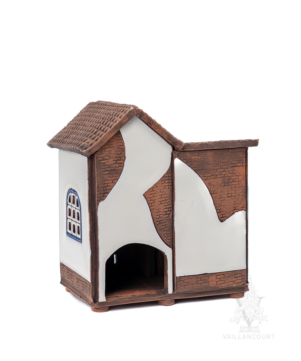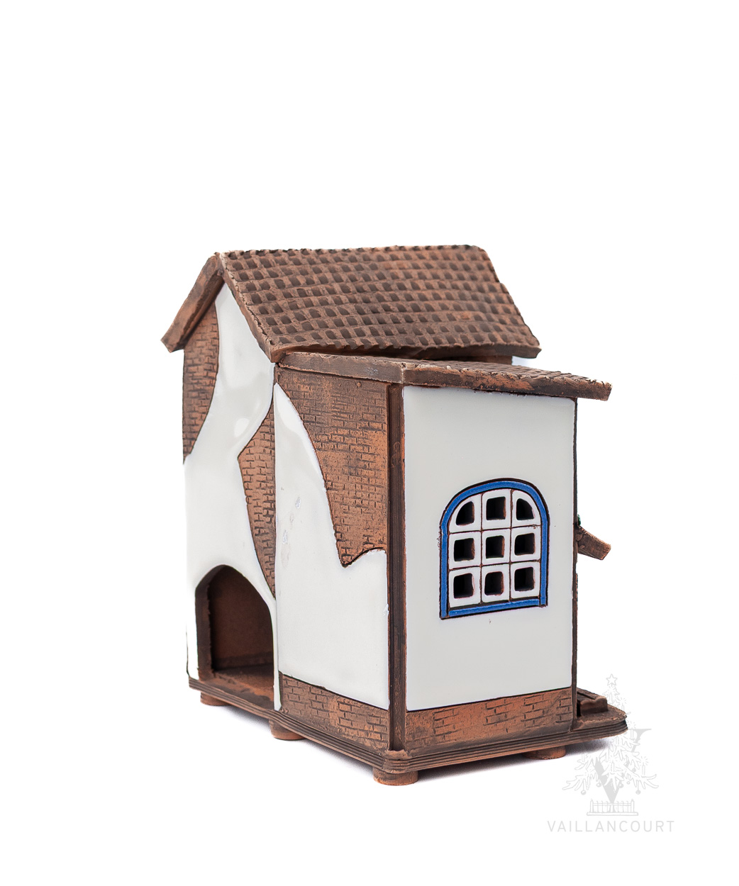 This ceramic building is intended to be used with coned incense or tealights so the smoke can be seen coming from the chimney. Handmade for Vaillancourt.