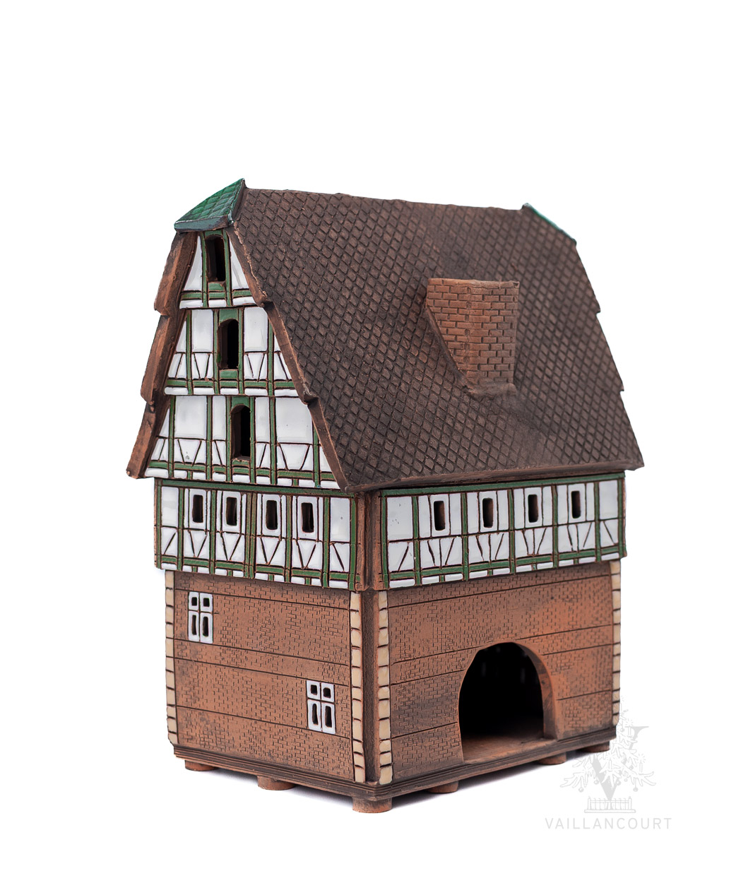 This ceramic building is intended to be used with coned incense or tealights so the smoke can be seen coming from the chimney. Handmade for Vaillancourt.