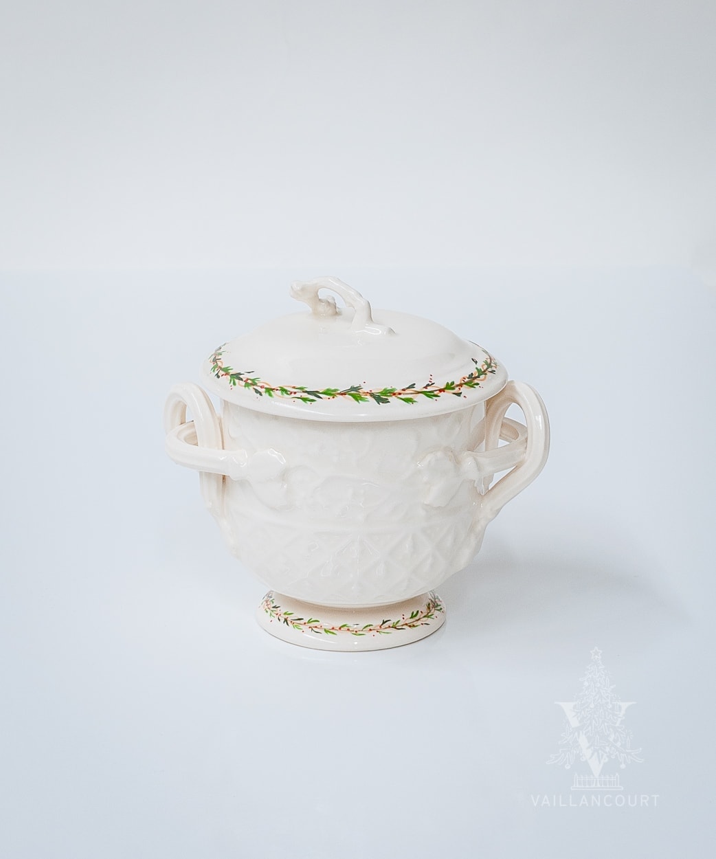 Judi Vaillancourt’s Classical Christmas Creamware. A subtle Christmas patterned dinnerware option that is an elegant way to host a Christmas dinner party, yet simple enough for every day use. Hand made by the now out of business Hartley Greens Leeds Pottery which operated out of Stoke-on-Trent, a city in central England.