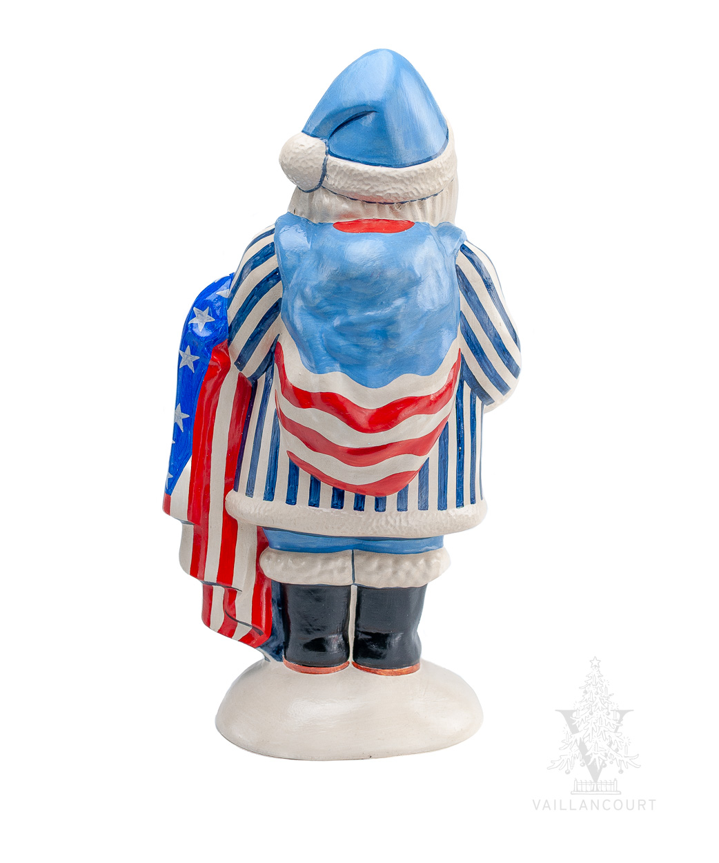 Celebrate America’s Semiquincentennial with the Founding Freedoms Santa, a striking symbol of patriotism and craftsmanship. Hand-painted in our Sutton, Massachusetts studios, this heirloom-quality chalkware Santa dons a vintage-inspired blue and white striped coat while proudly holding a golden eagle—an enduring emblem of American strength. Draped with a flowing American flag, this piece honors the spirit of 1776 with a reverent nod to liberty, unity, and the pursuit of excellence. Every element, from the hand-cast plaster to the oil-based paints, is sourced and crafted in the United States, making this a truly American collectible for generations to come.