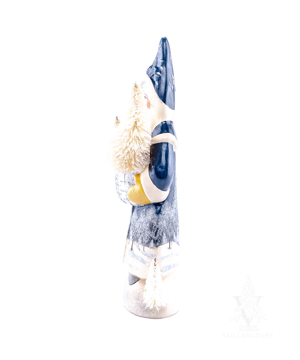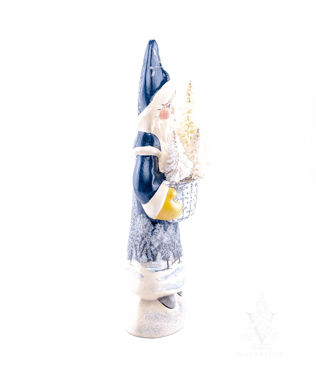 Using striking dark blues for his coat, this Santa displays a beautiful night woodland scene with trees adorned with snow and ice. Holding a shimmering silver-leafed basket filled with frosted white bottle brush trees, this Christmas collectible is a perfect compliment to Vaillancourt’s 35th Anniversary collection.