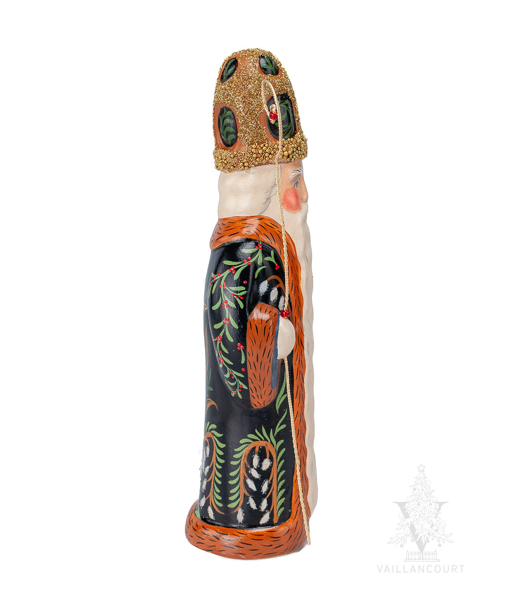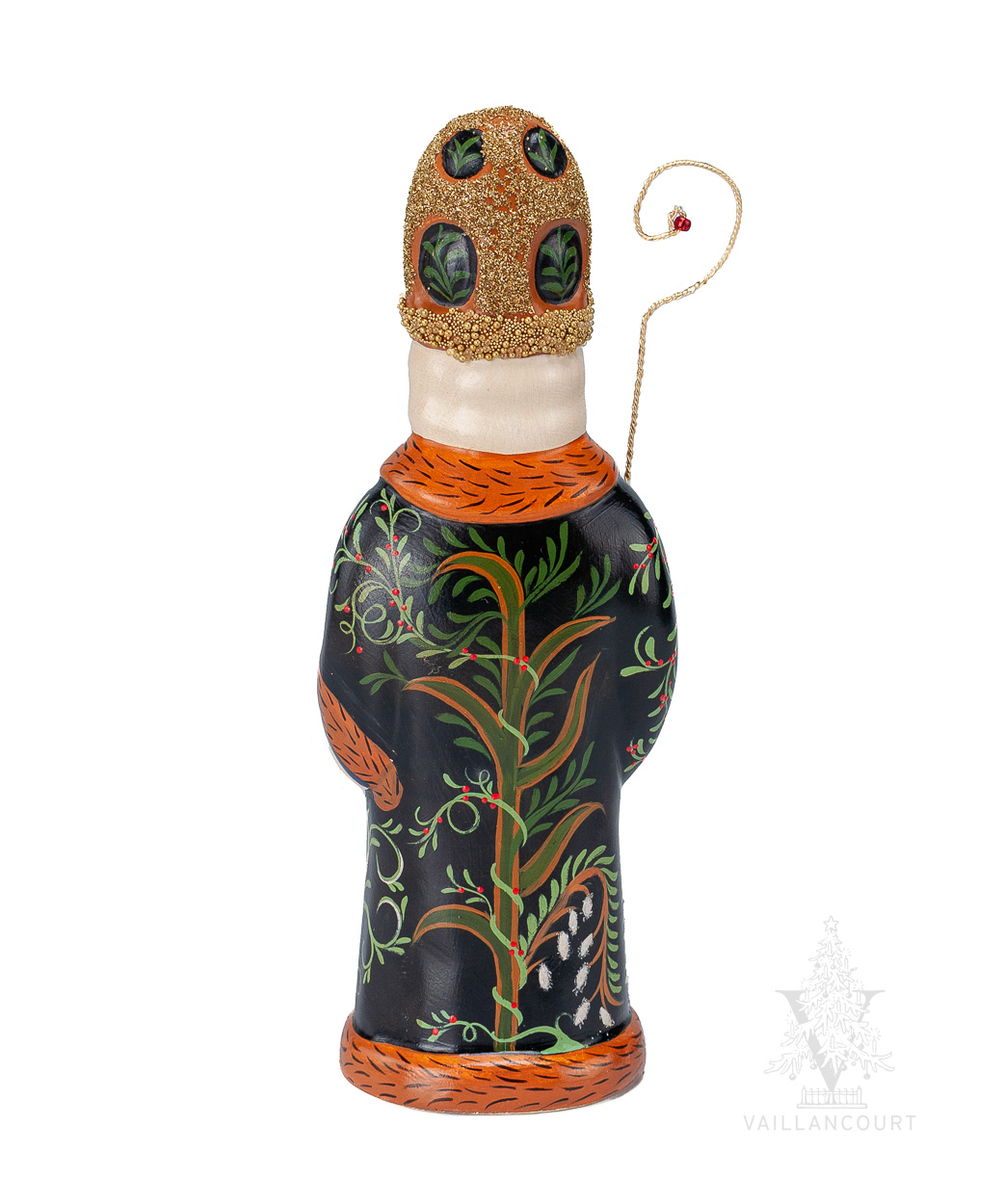 This St. Nicholas in a black cloak, decorated with a detailed floral and arbor design, is holding a hand-twisted wire staff. His bishop’s hat continues the design along with a gold beaded embellishment.