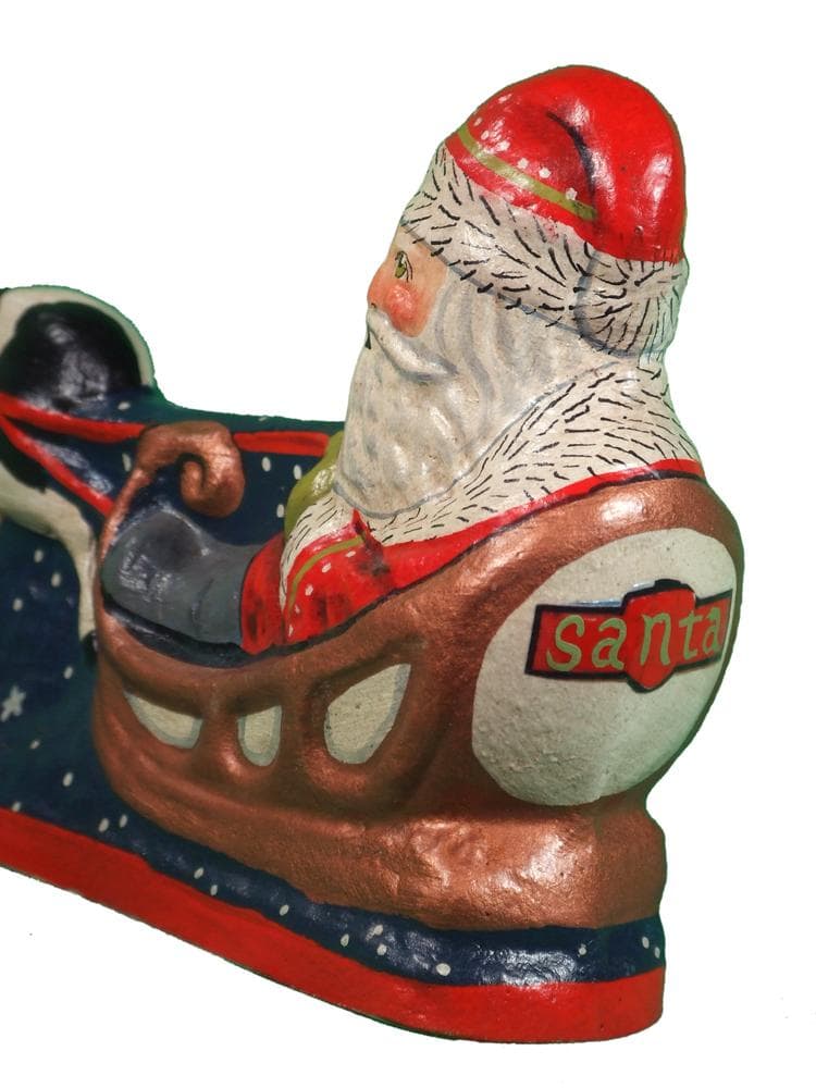 This santa and sleigh being pulled by a cow was originally created for a corporate customer but because of it’s wild success we have released a few as a Vaillancourt Exclusive. This piece is a combination of two moulds, adhered together, and painted in our Sutton studios.