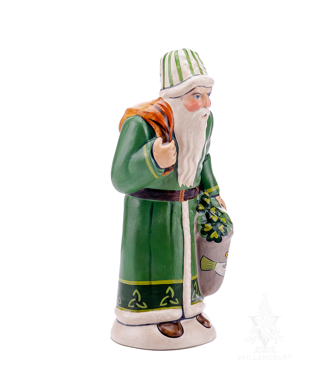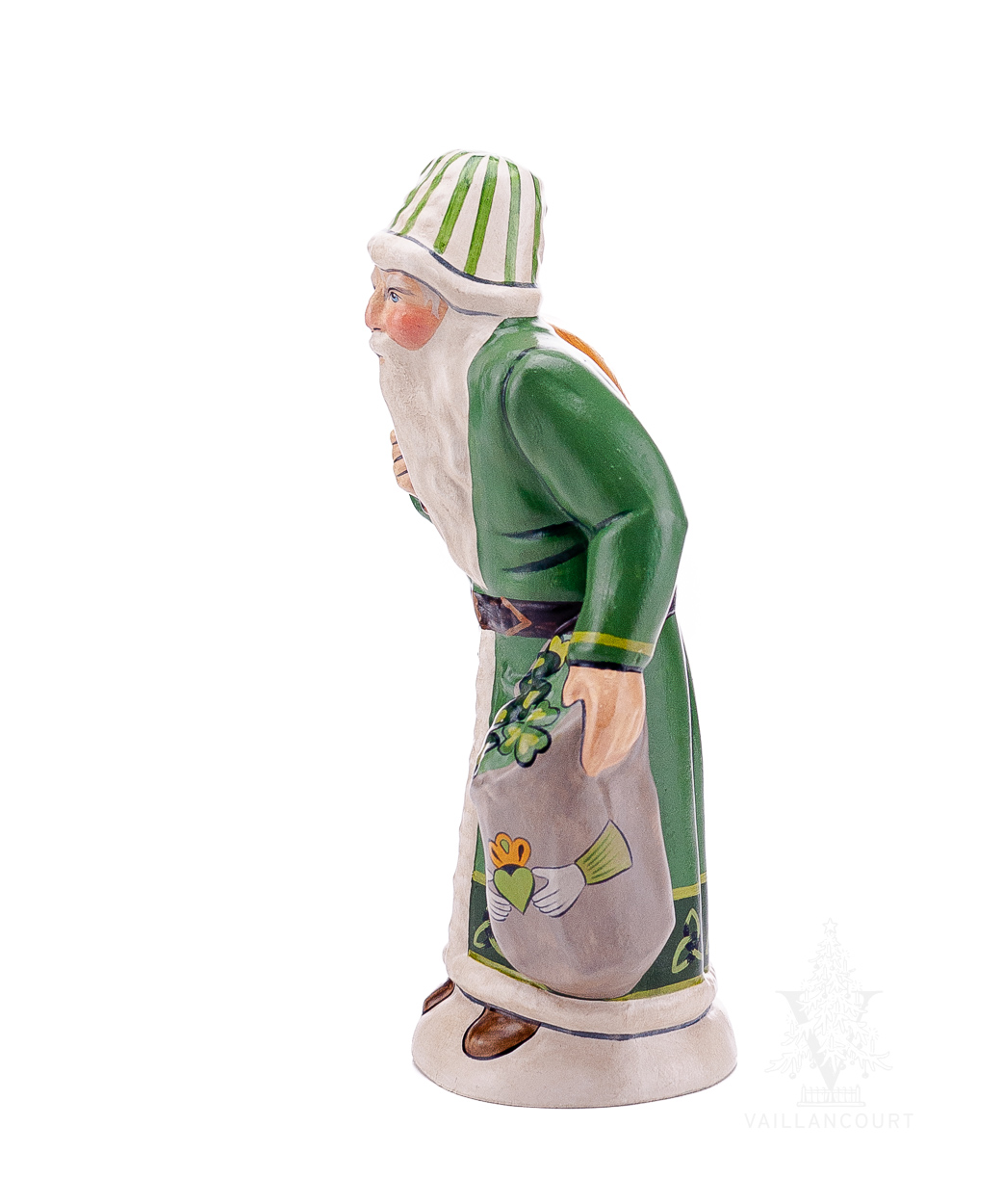 You don’t need the “Luck of the Irish” with this piece. The Irish Santa is seen in green garbs decorated with the Celtic Triquetra Knot. His sack is overflowing with clovers and is decorated with a beautifully painted Claddagh.