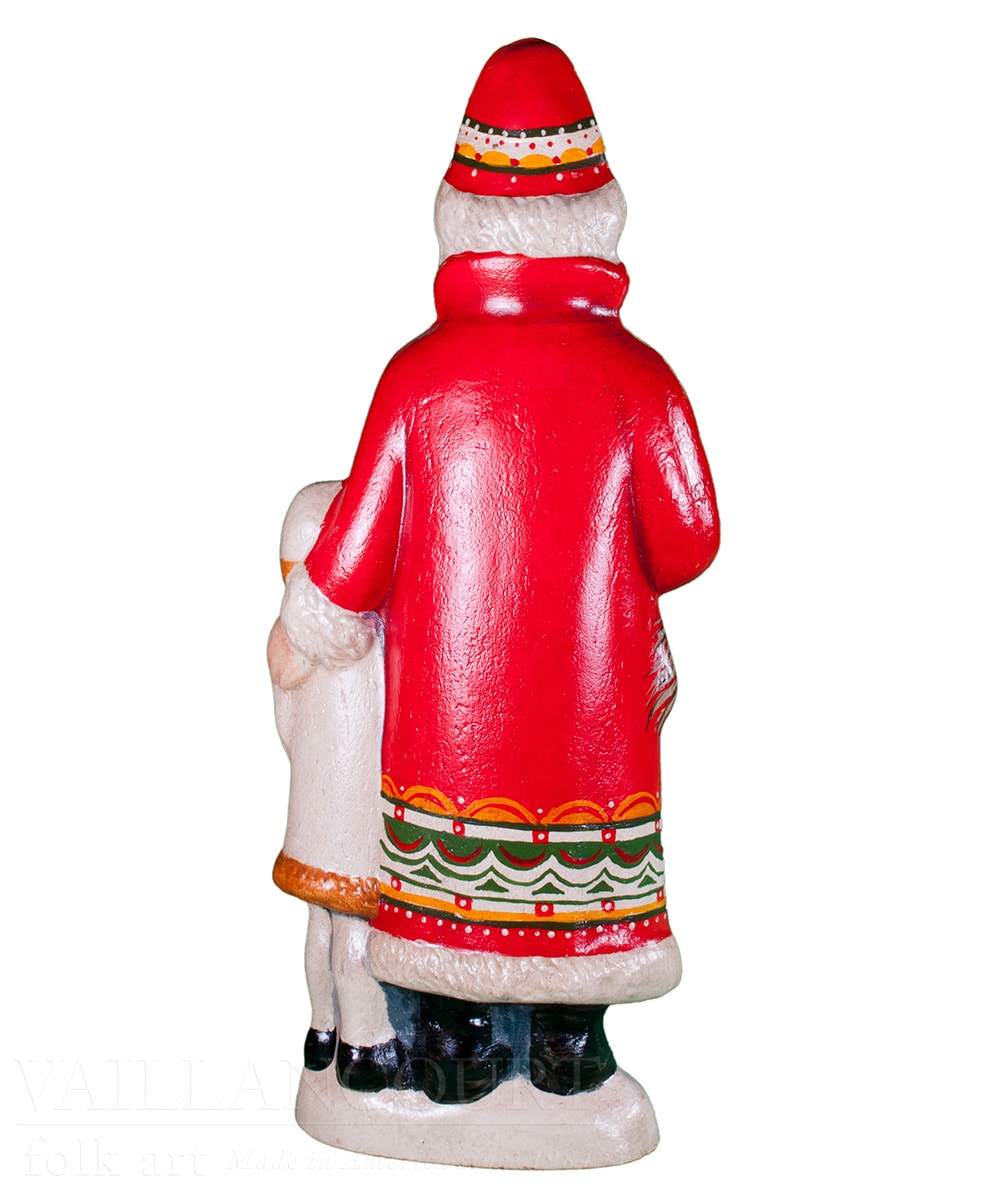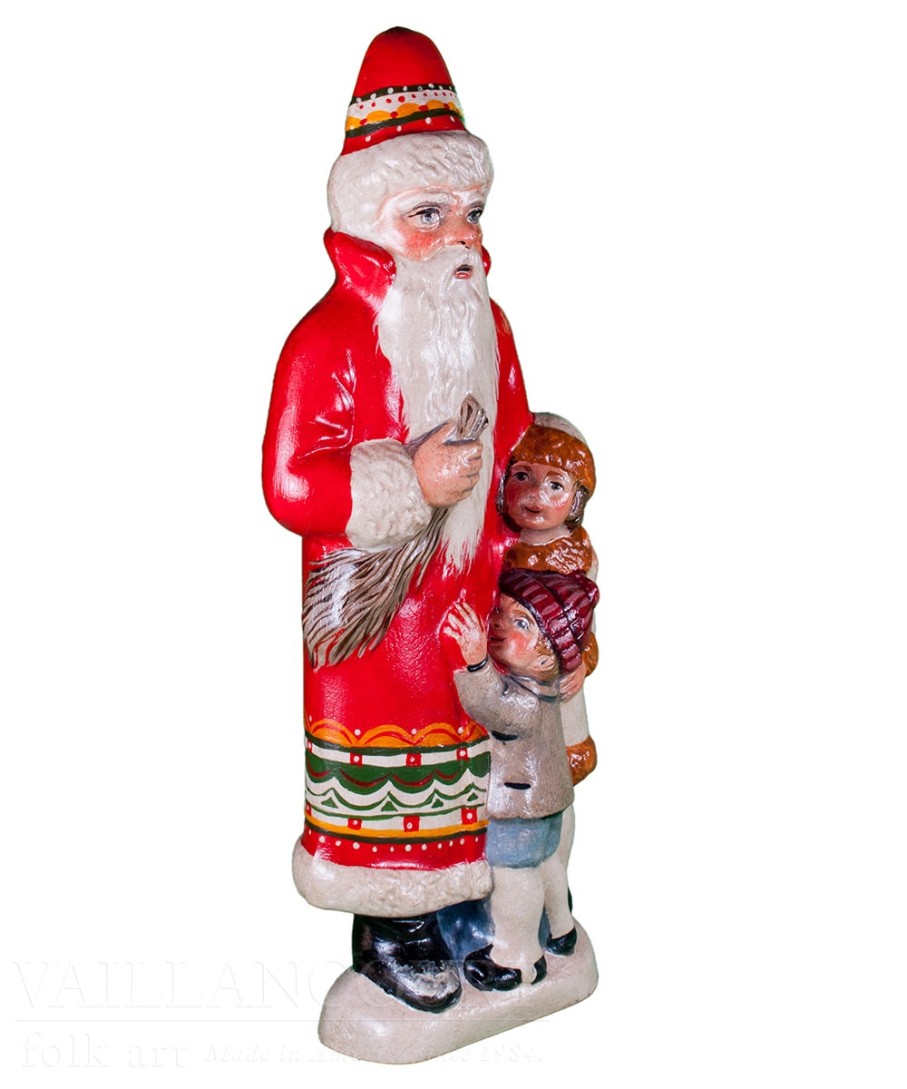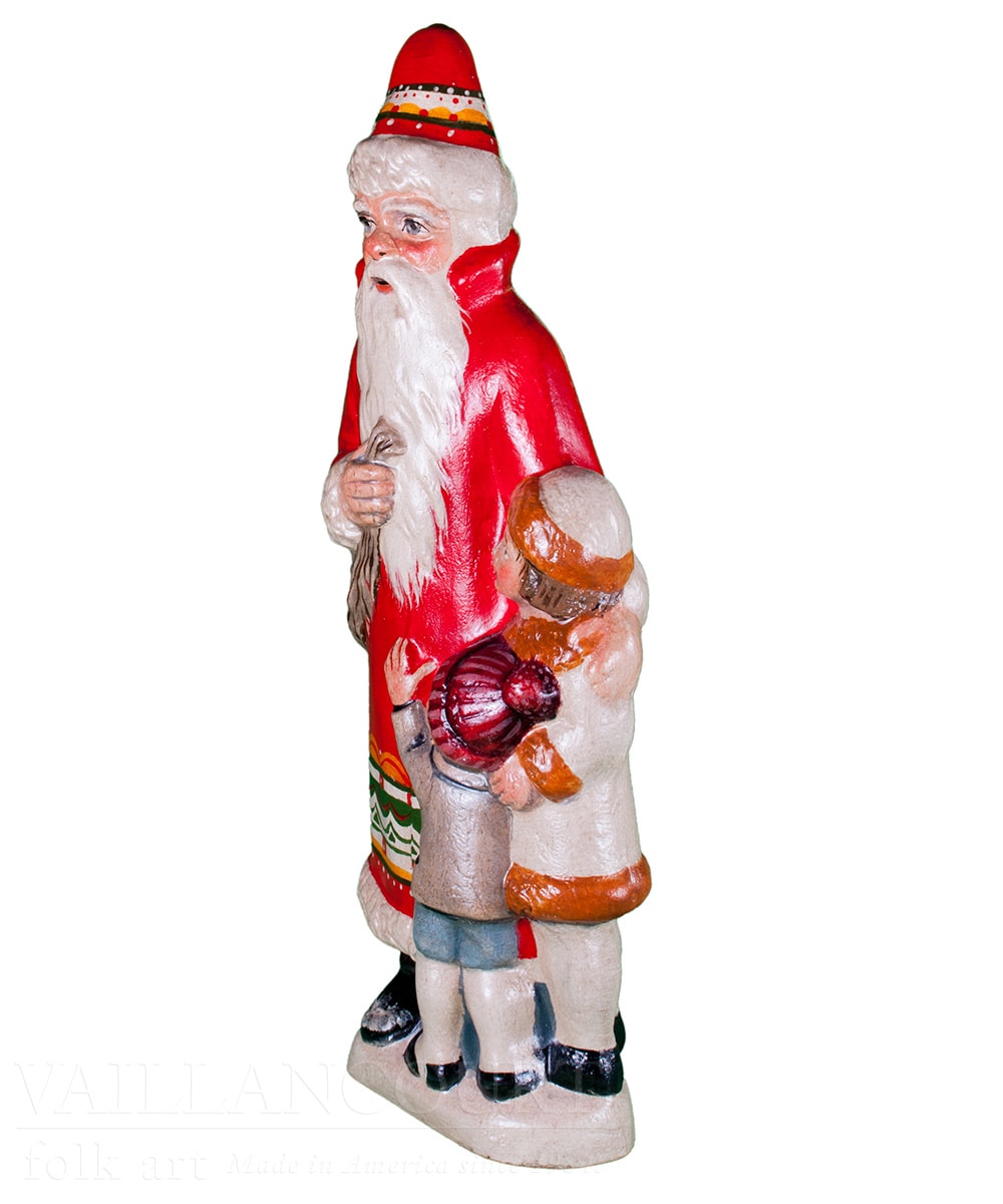 Introduced as a custom design for Nordstrom for their 2011 season, this Chalkware Father Christmas with two children was made from a vintage German chocolate mould from the early 1900s and was hand painted in Sutton, Massachusetts. Using colors and patterns historic to the time period of this mould, this Father Christmas’ red coat is highlighted by a green and white pattern. The faces of both children and the Father Christmas is highly detailed and nostalgic to the holiday season.