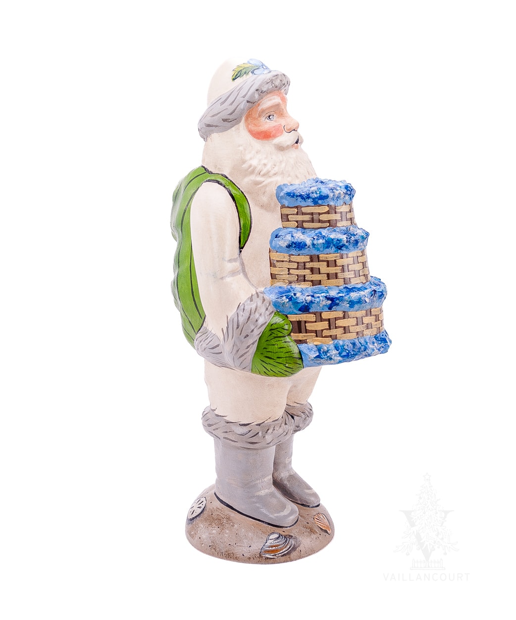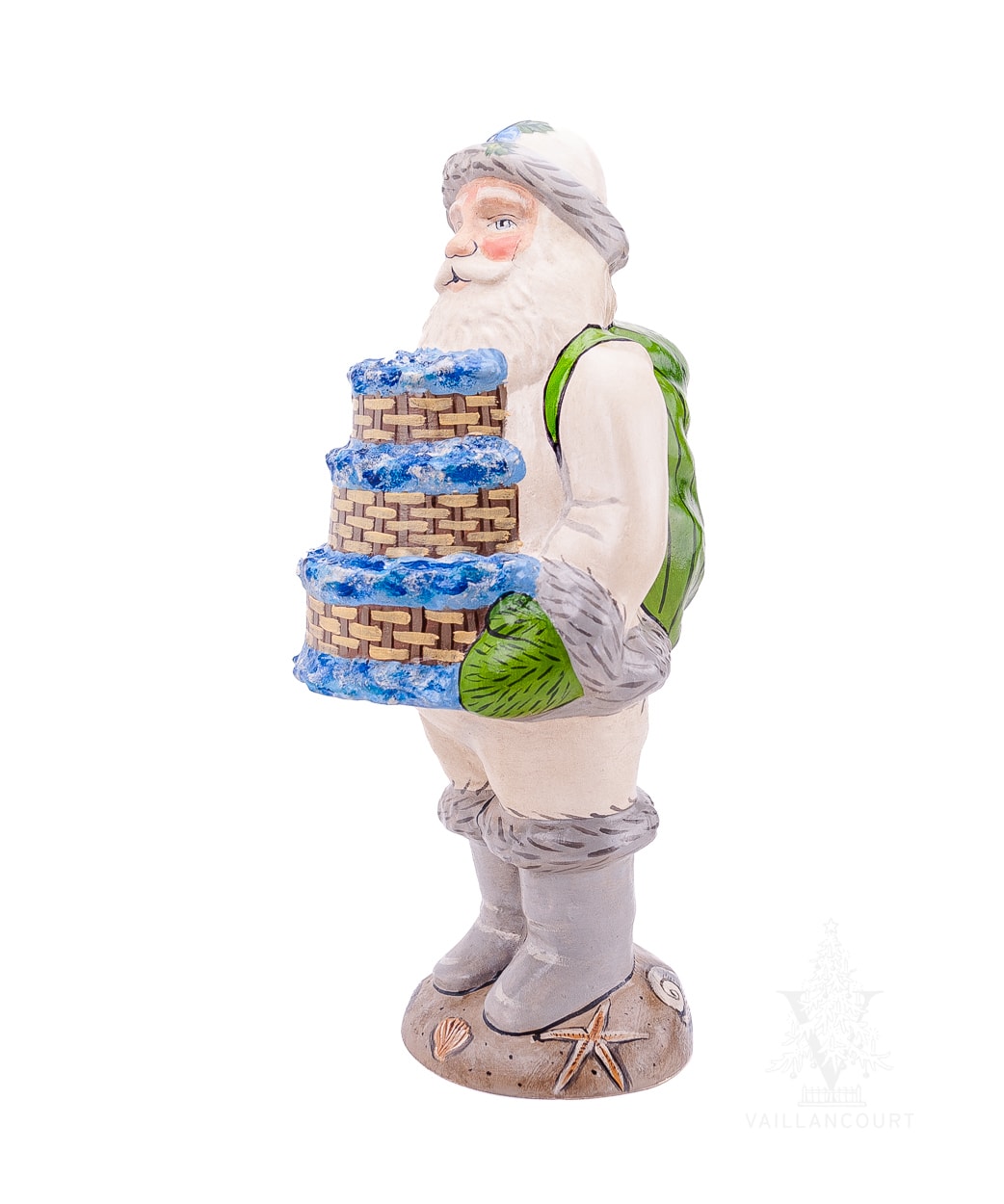 The Nantucket Santa With Stacked Baskets of Hydrangeas celebrates ten years of our Nantucket Santa series with a design that captures the island’s coastal charm and natural beauty. Dressed in a sun-bleached white coat trimmed with grey fur, this Santa evokes the weathered sails of boats long at sea. At his feet lie hand-painted beach shells, and in his arms, he carries a stacked Nantucket basket brimming with blue hydrangeas—reminiscent of those blooming along the bluff in Sconset. It’s a tribute to both the elegance and simplicity of Nantucket living.