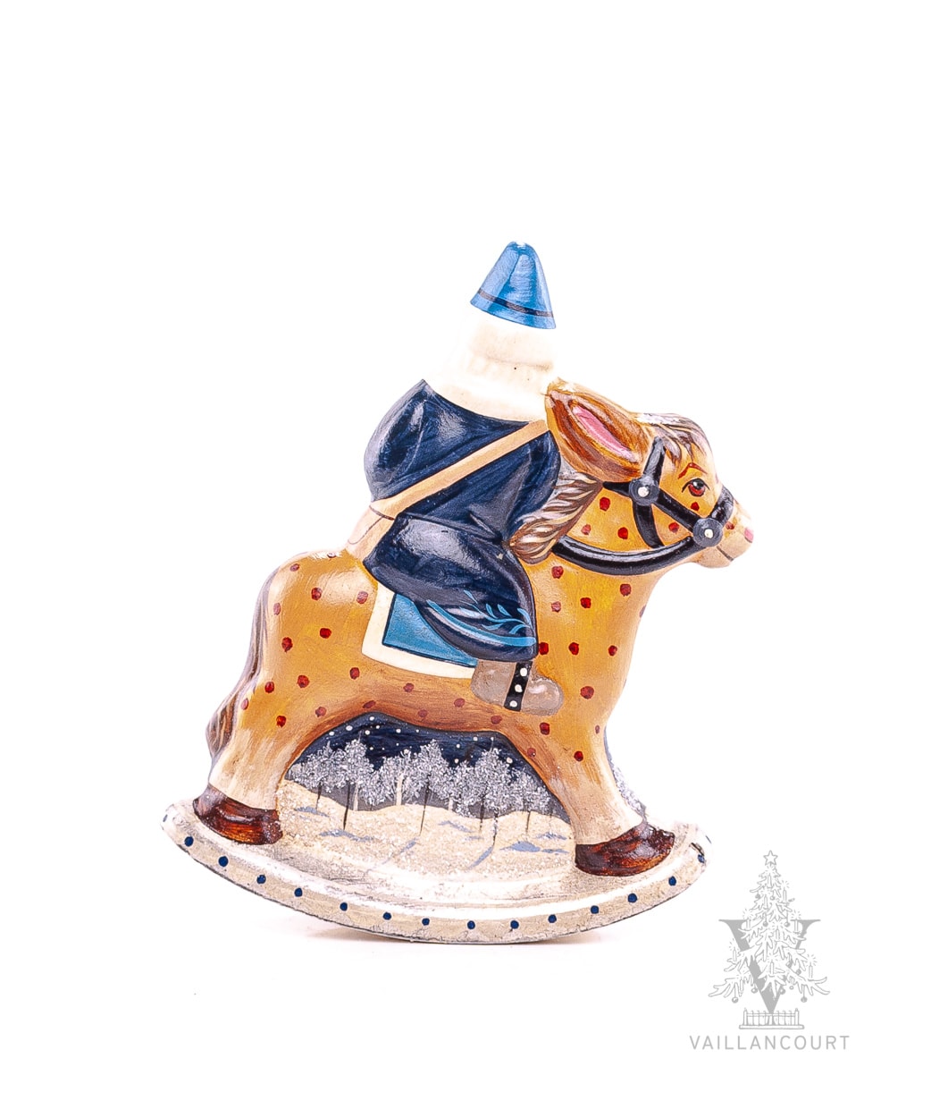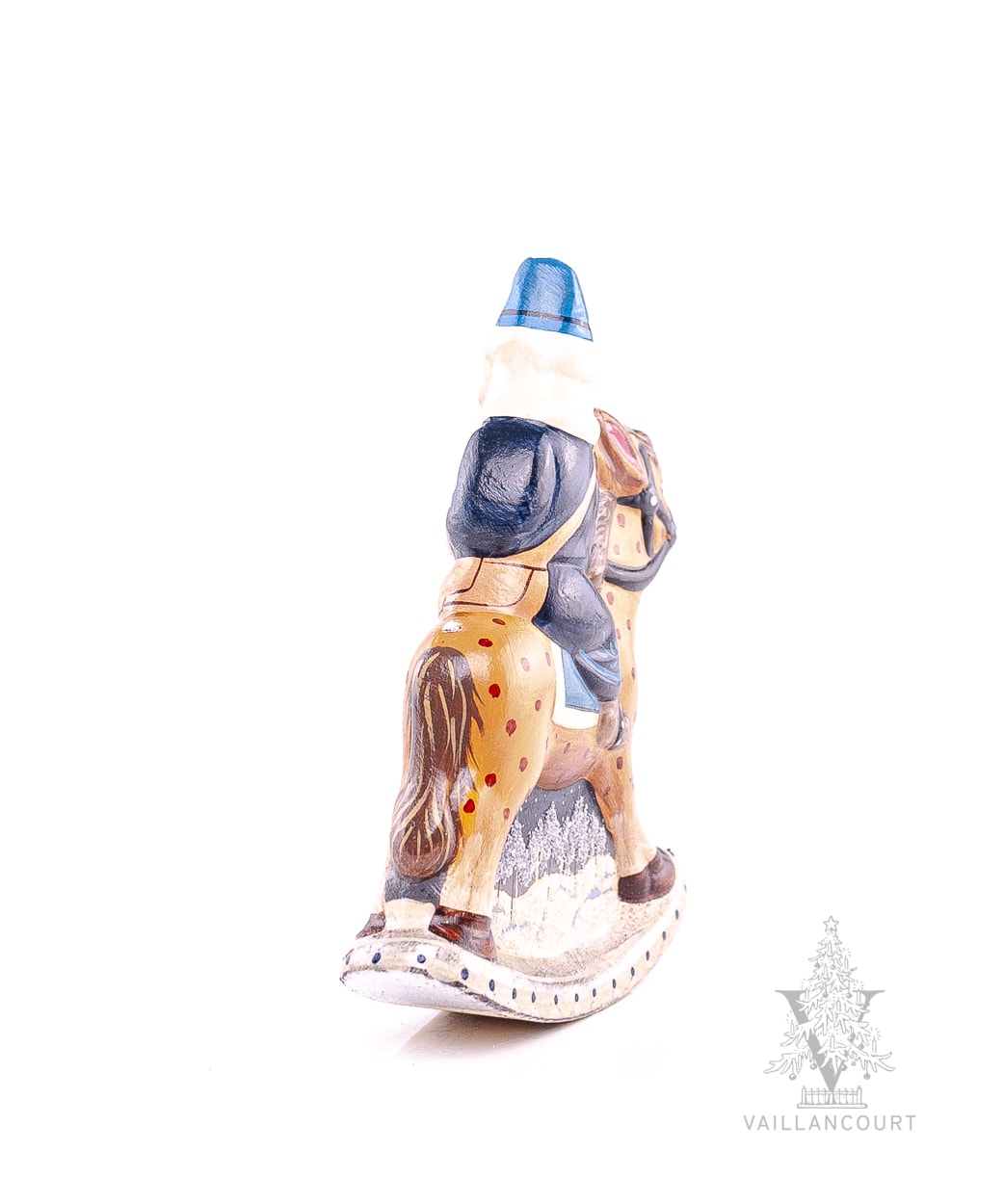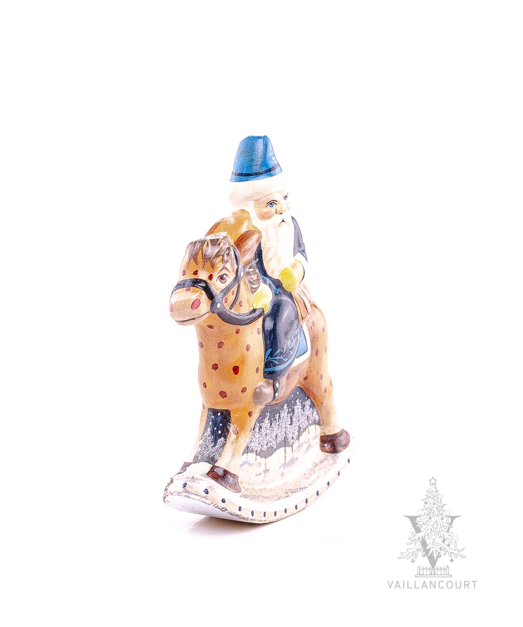 This Santa features a blue coat and a wintery scene while riding atop a spotted horse.