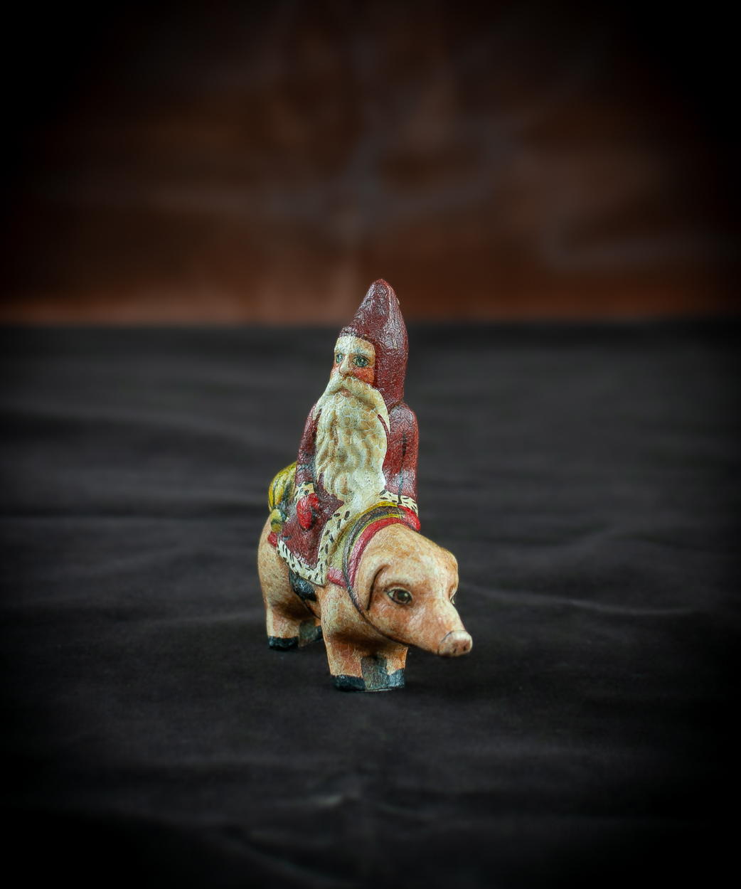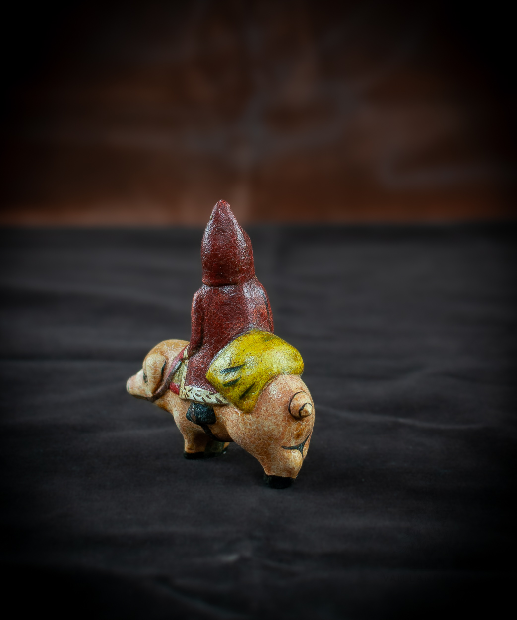 The Santa on a Pig is, in part, inspired by a Scandinavian gift giver, bearing a striking resemblance to the Father Christmas. This mythological creature, which is likened to a garden gnome, protects both children and animals from evil and is often seen helping with chores. Like Santa, he hands out presents and, according to folklore, is often seen with a pig. In the Vaillancourt Folk Art tradition, this gift giver’s feet are tired and has chosen to ride the pig while delivering presents.