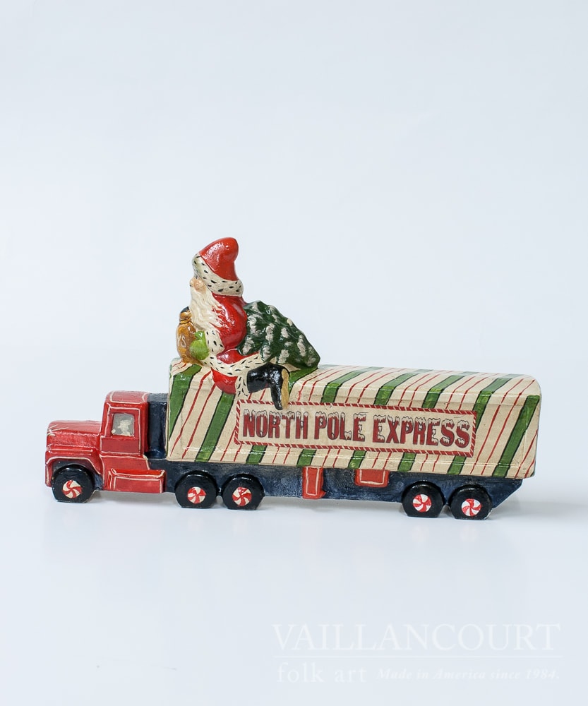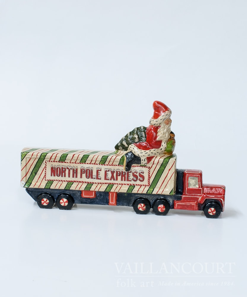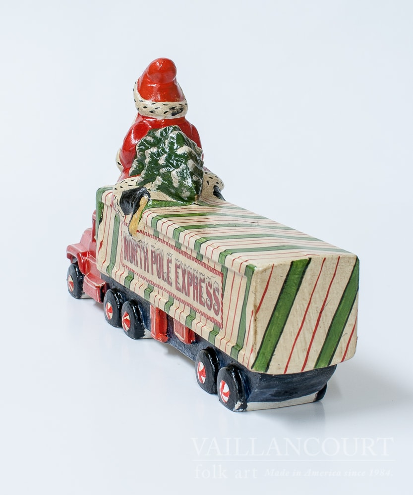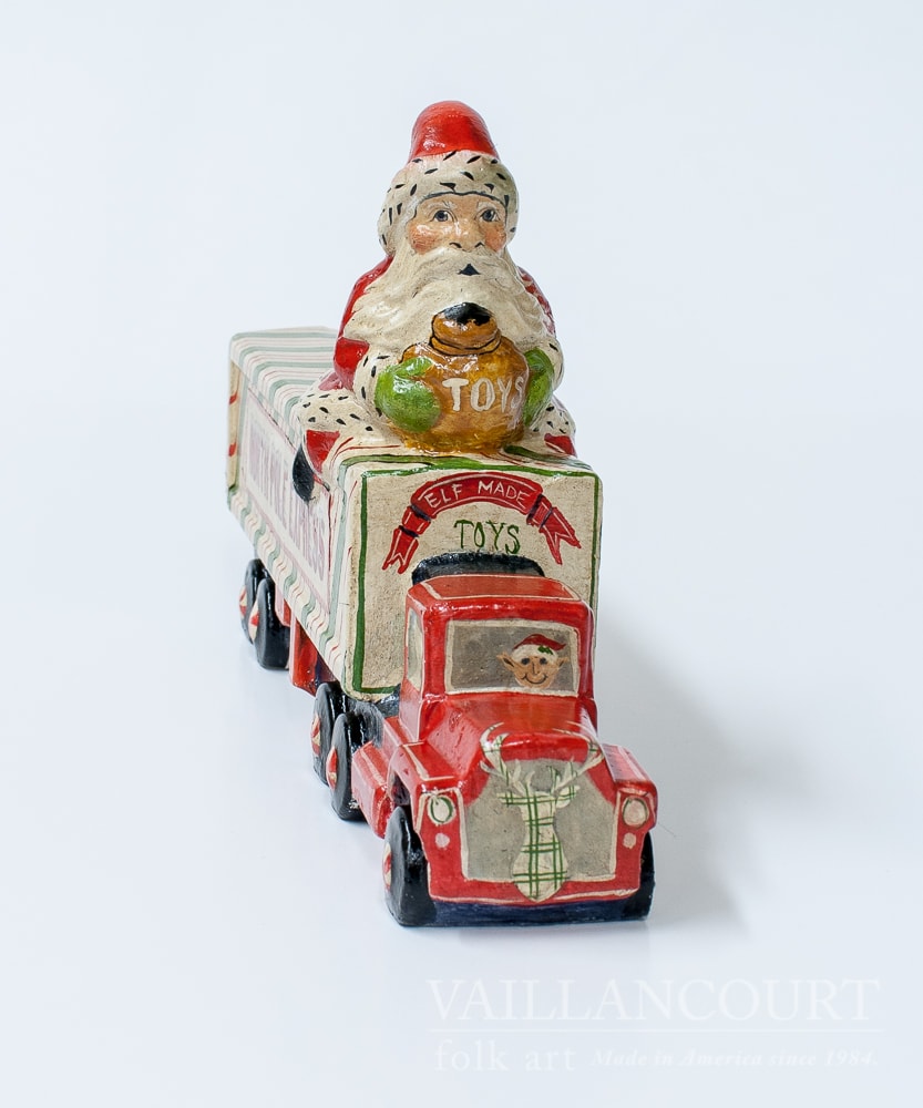 Riding his 18 wheeler truck, this hand painted Chalkware Santa by Vaillancourt Folk Art is sure to deliver on time regardless the location.