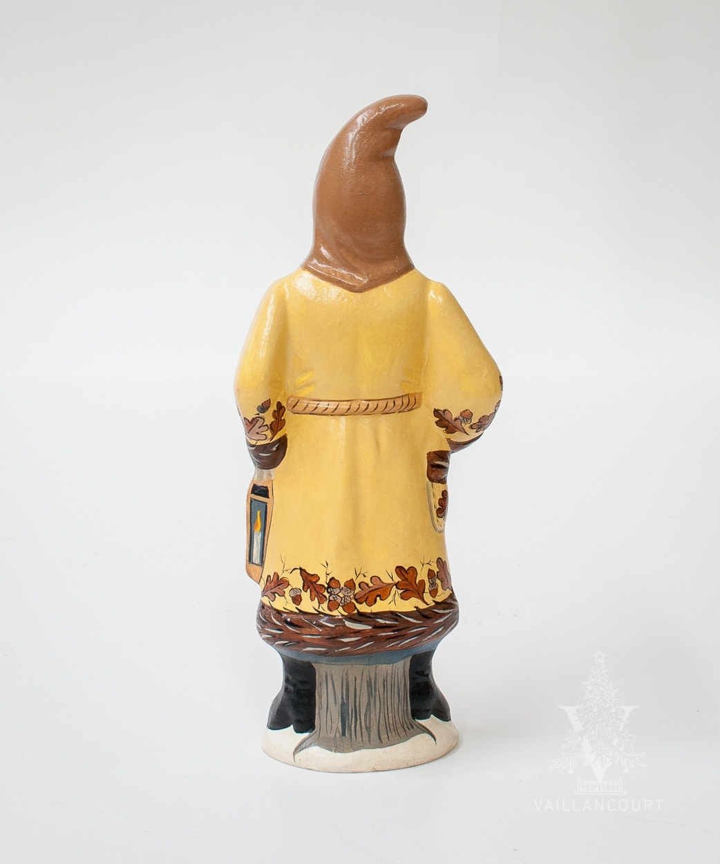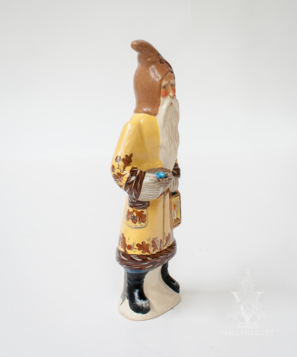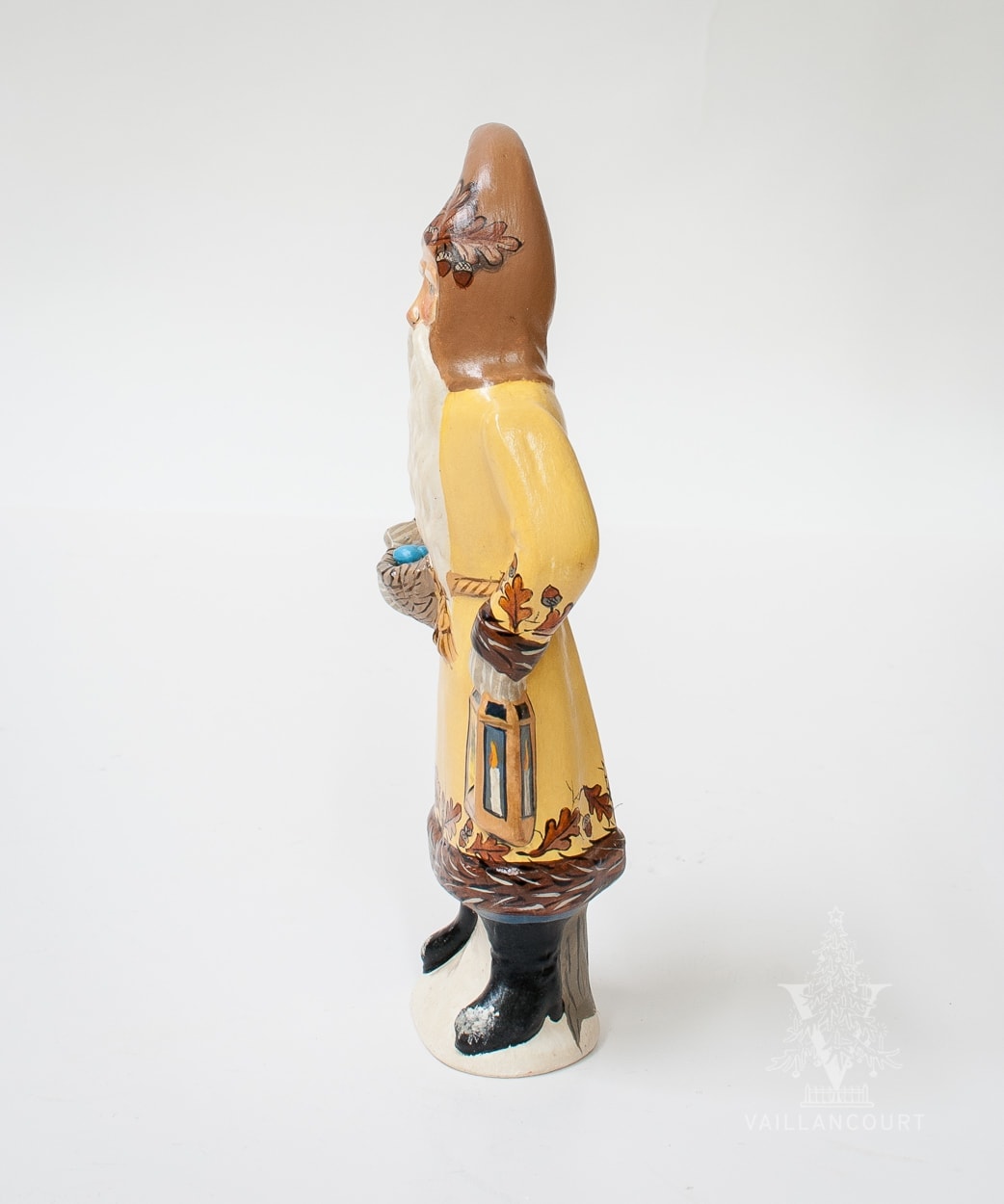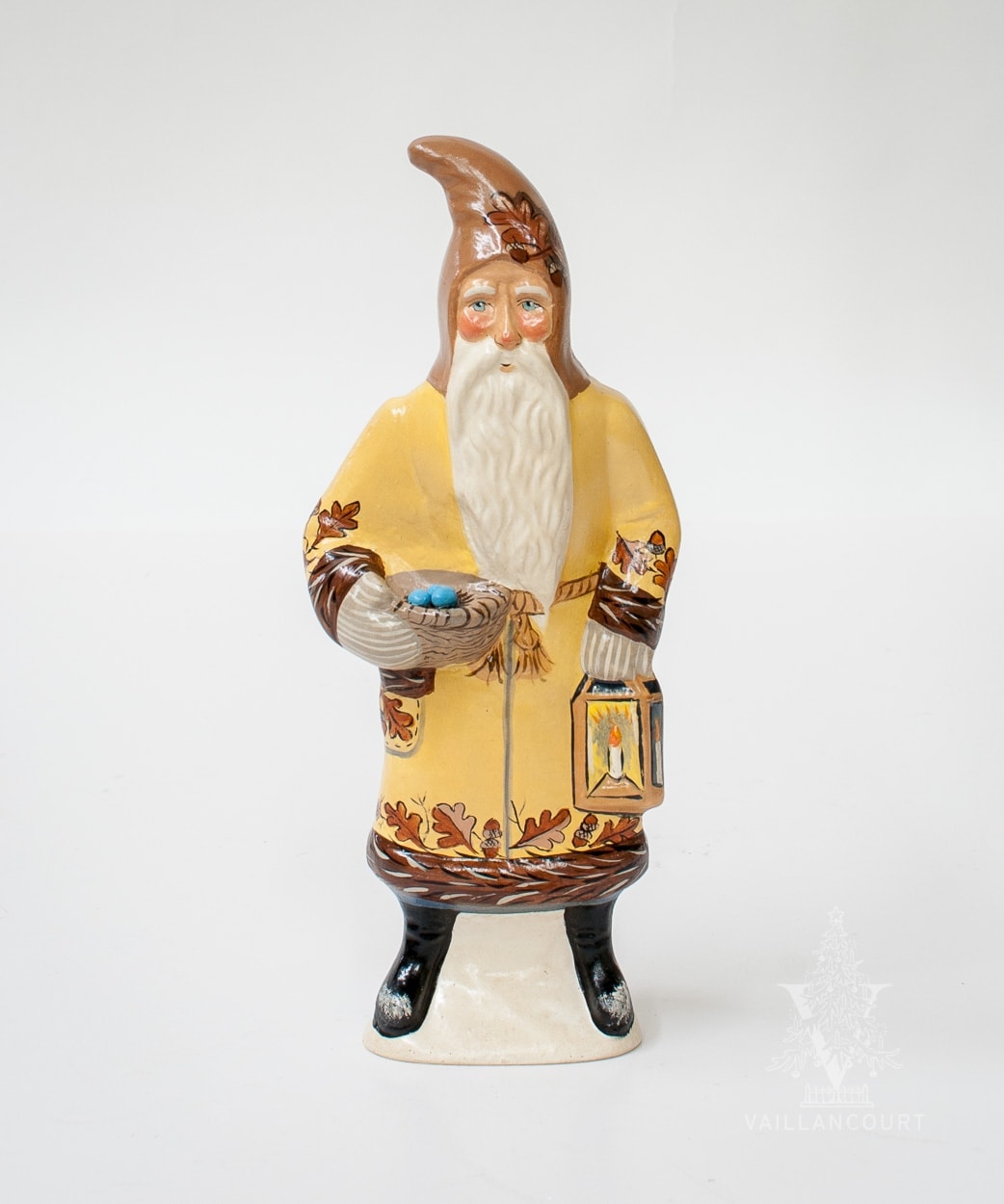An exclusive for The Thicket, we feature a European-style Father Christmas in a yellow coat holding a lantern in one hand and a nest with blue Robin’s eggs in the other. Adorned on the coat is oak leaves with acorns delicately painted.