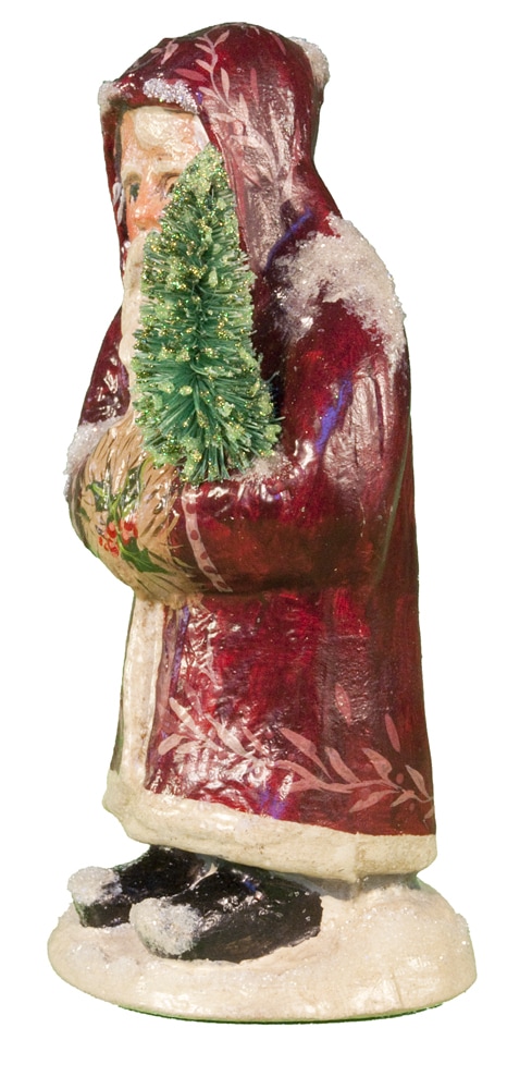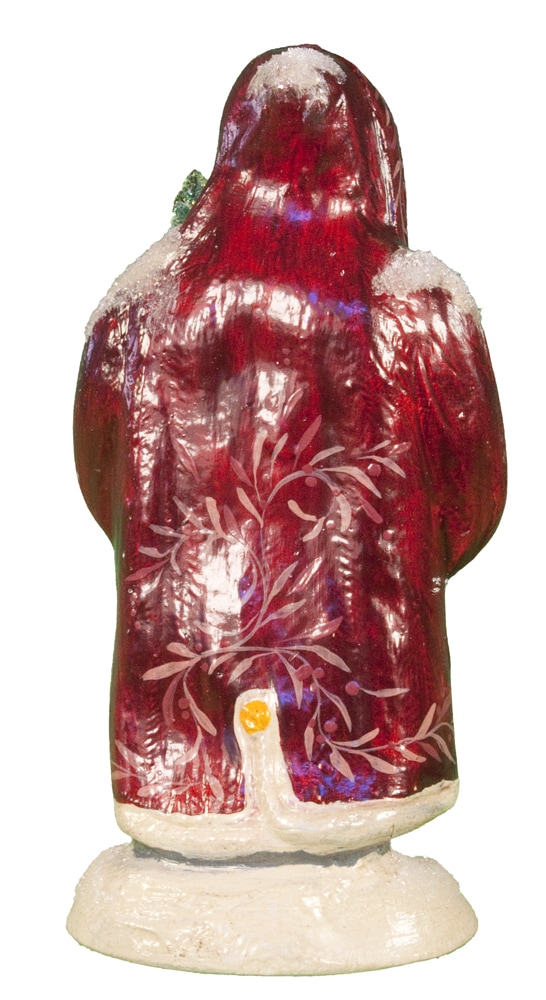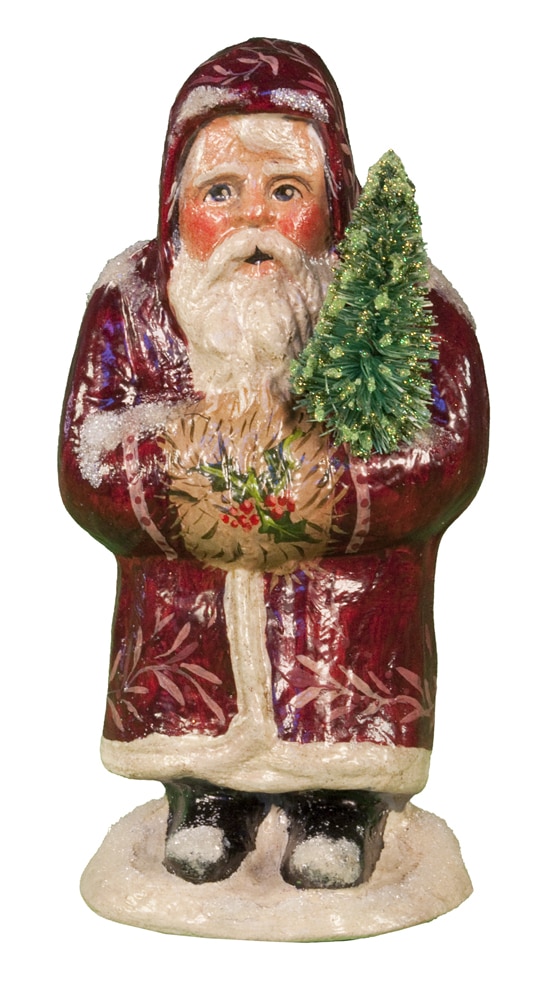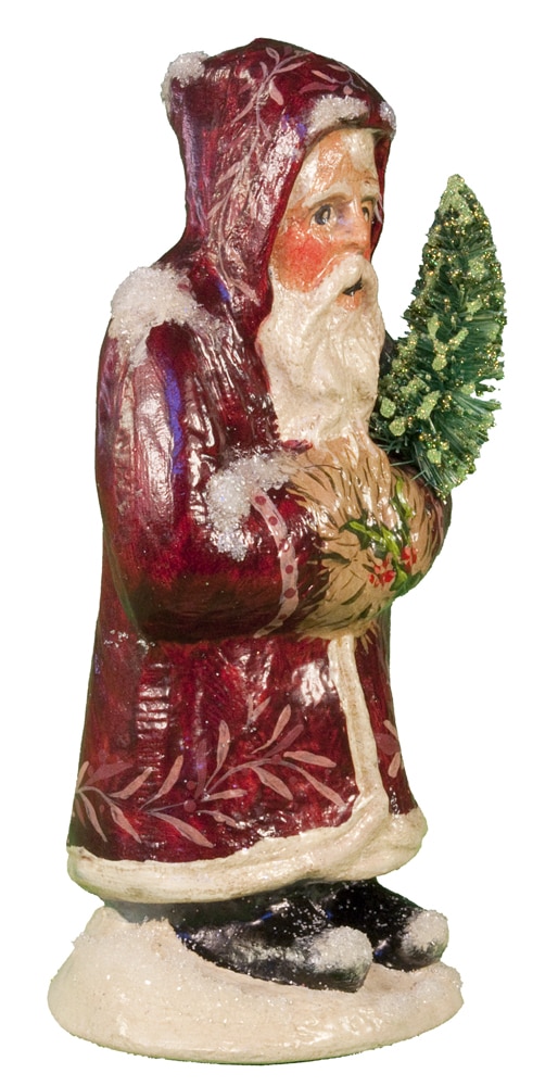 Introduced exclusively for Nordstroms (11063), this Small Chalkware Father Christmas was hand painted in Sutton, Massachusetts with a brilliant Maroon coat with delicate holly patterns. With rich detail in his face and eyes, combined with the detail of the holly and ivy in his hands, this Father Christmas is rich in tradition and emotion. In his arms, this Father Christmas is holding a replicated antique bottle brush tree with glittered detail.