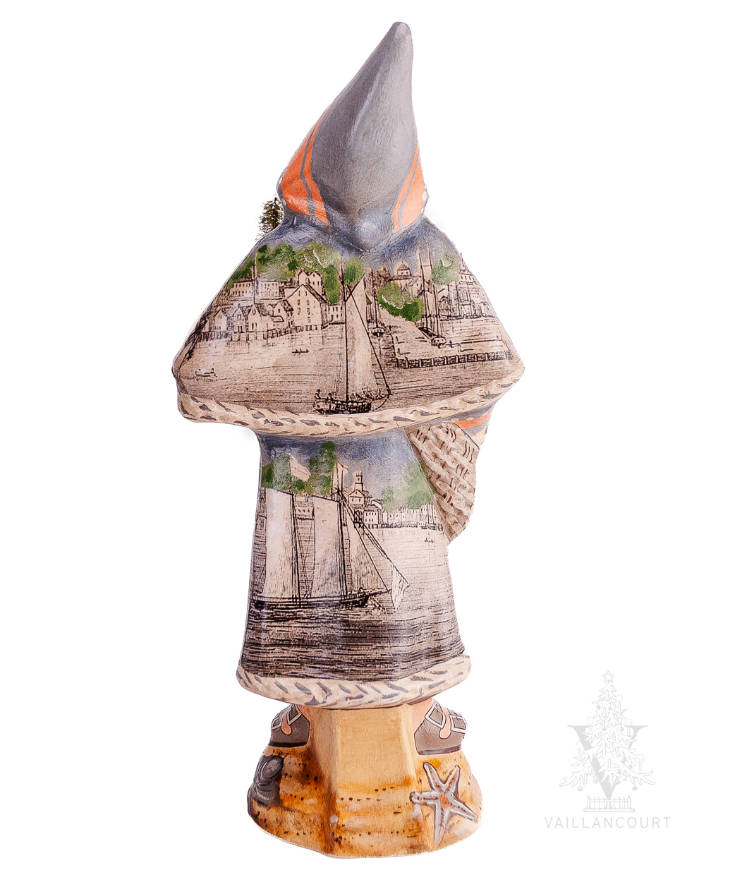 The third Santa of a Provincetown series, this piece was designed exclusively for Monty’s using a reproduction engraving of the historic town drawn by John Warner Barber. Provincetown was just one of 200 Massachusetts towns featured with an engraved view in the book, Historical Collections, History and Antiquities of EVERY Town in Massachusetts, published in Worcester, Massachusetts by Dorr, Howland & Co. in 1839. The engraving has been decoupaged onto the Santa’s coat.