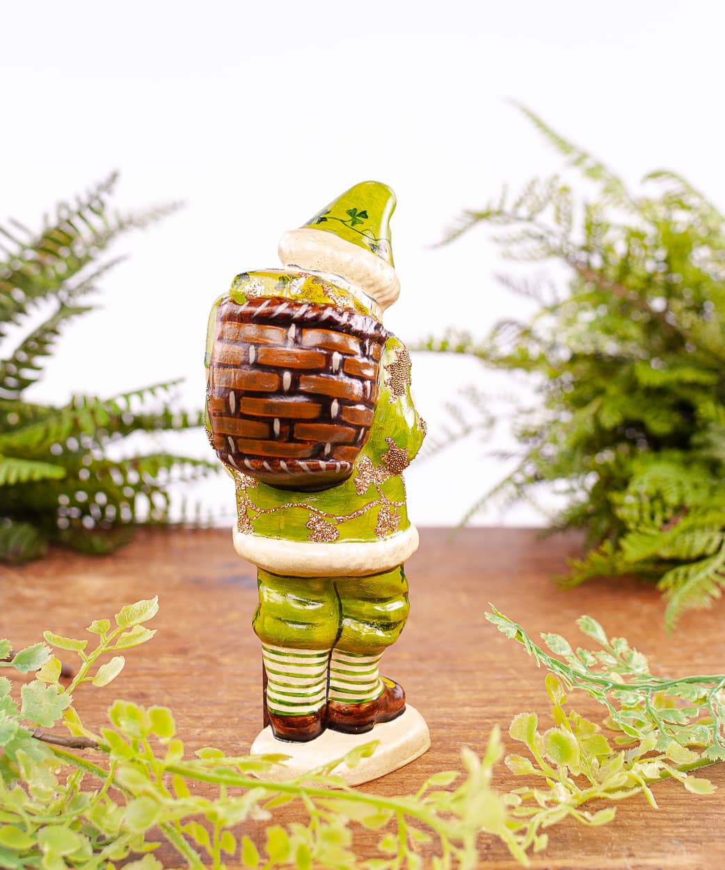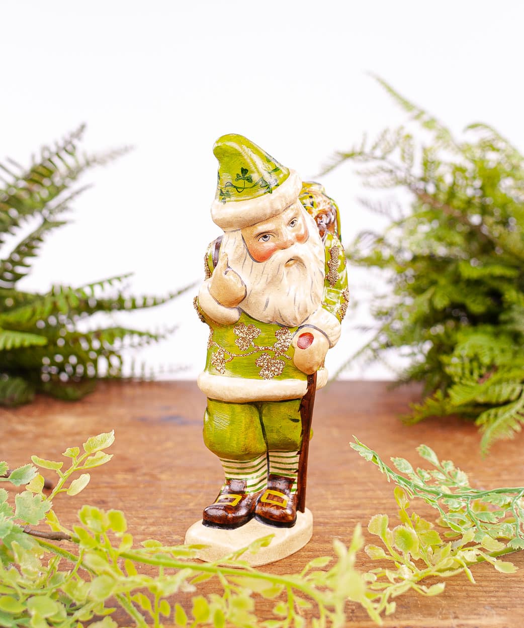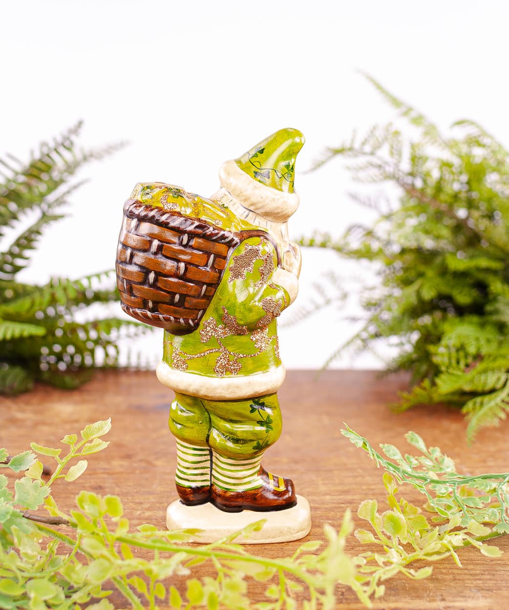 Santa has his shillelagh in hand and is ready to march in the Parade. He is looking sharp in his gold beaded shamrock coat, shamrock hat and gold buckle shoes. A happy leprechaun friend has hitched a ride in his beautiful wicker basket to carry all the sacks of gold he has found at the end of the rainbow.