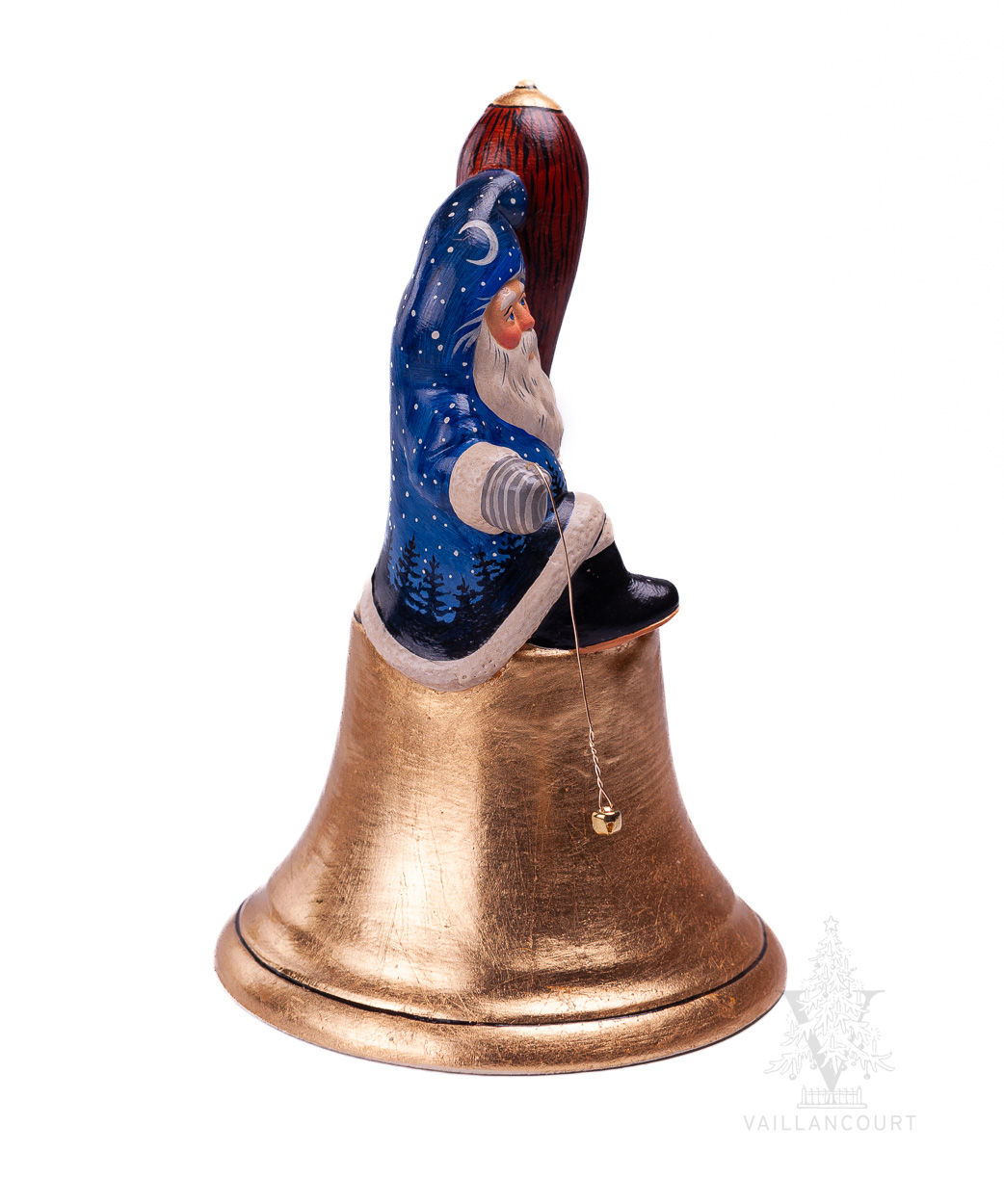 Midnight Sky Santa on School Bell is a charming chalkware piece from Judi Vaillancourt’s ongoing The Bells series, blending holiday nostalgia with personal history. Perched atop a gleaming gold school bell, Santa wears a deep blue coat dotted with stars, evoking the quiet wonder of Christmas night. This design was inspired by Gary Vaillancourt’s childhood memories of his primary school bell—used to mark the rhythms of the school day—which he later reclaimed at auction. Both whimsical and meaningful, this piece celebrates the joy of Christmas and the cherished echoes of the past.
