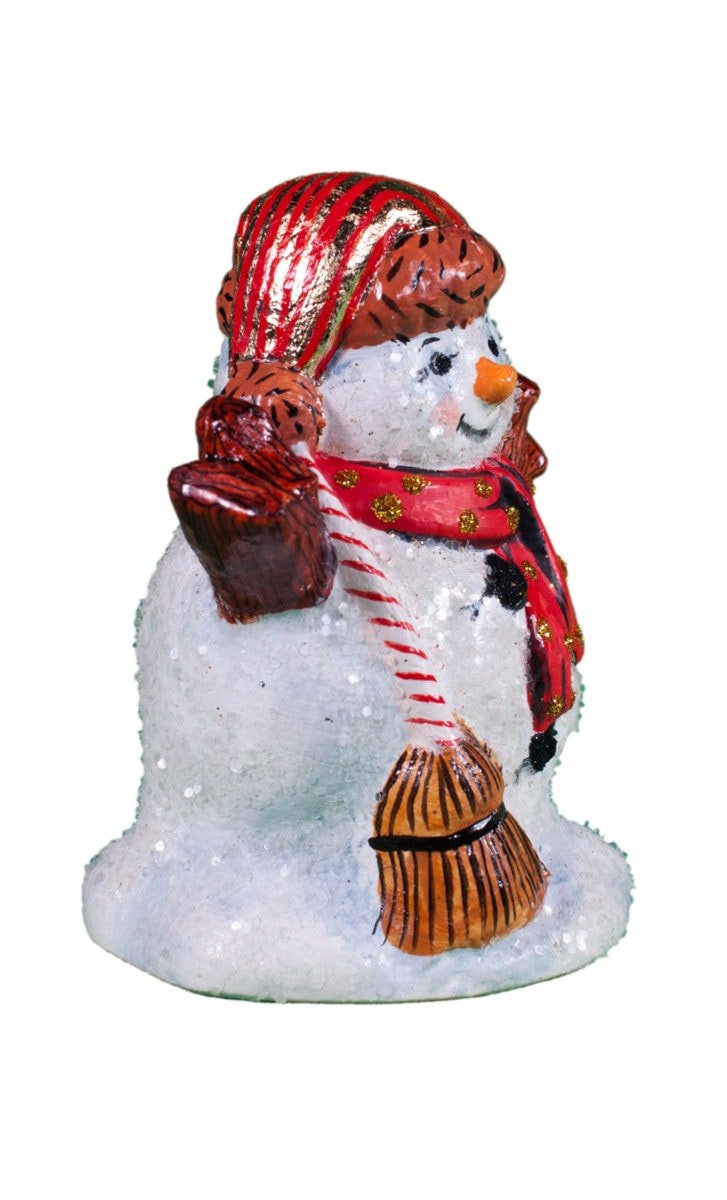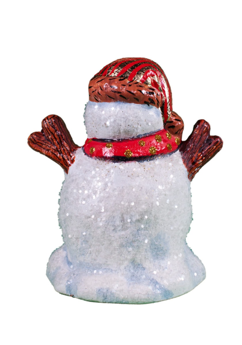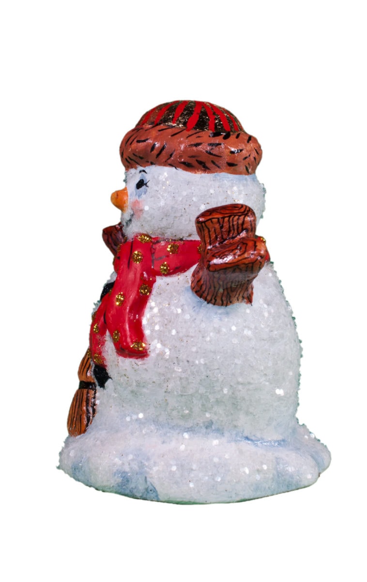 A custom piece for Neiman Marcus, this small Snowman is created with Victorian Glass Glitter for snow and is kept warm with a fur lined hat and decorative red scarf with gold glitter decorations. With stick arms, he has a hard time gripping the peppermint stick broom handle.