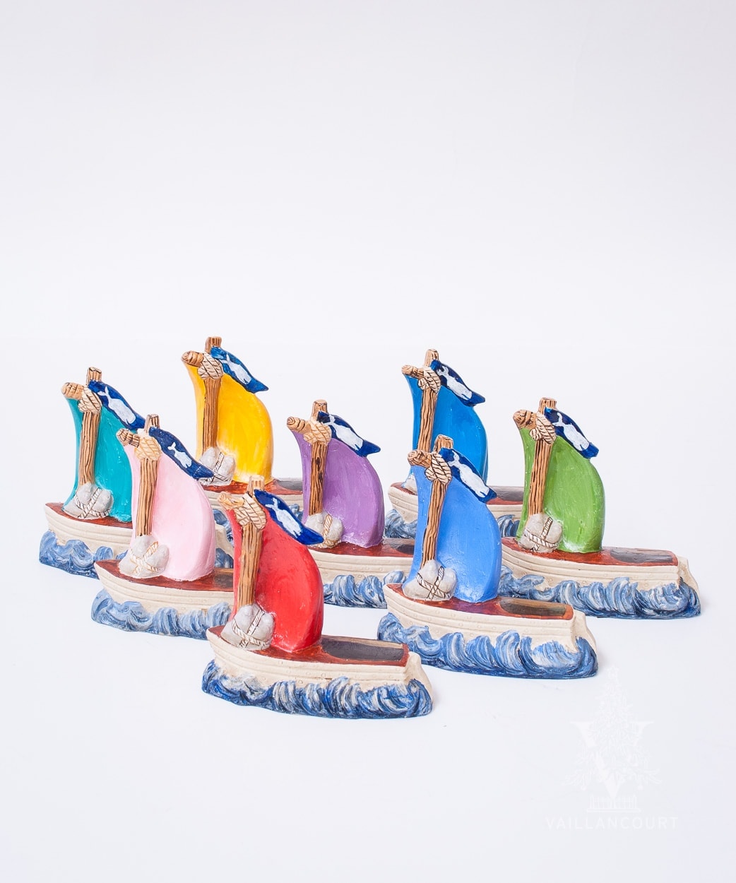 A new Chalkware series to celebrate Nantucket’s Rainbow Fleet! Using antique ice cream moulds, each catboat has been moulded and hand carved to resemble the Nantucket Yacht Club’s boats first used to inspire children and teenagers to learn to sail. Each piece is hand painted with sails to resemble the original fleet. Each boat is designed with the whale flag, which can be found with some of the other Vaillancourt Nantucket Series pieces.