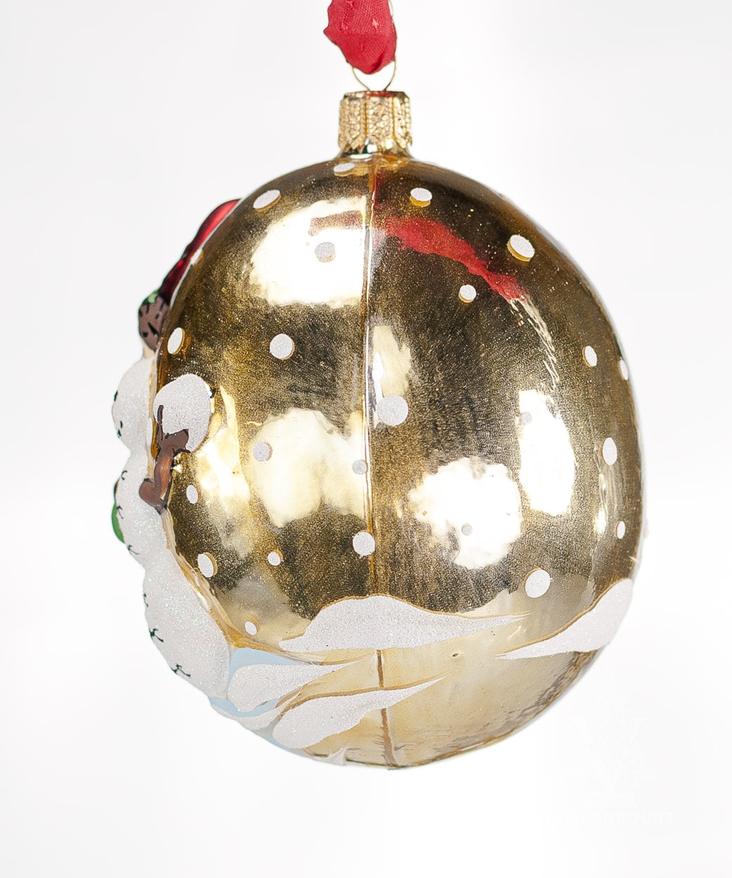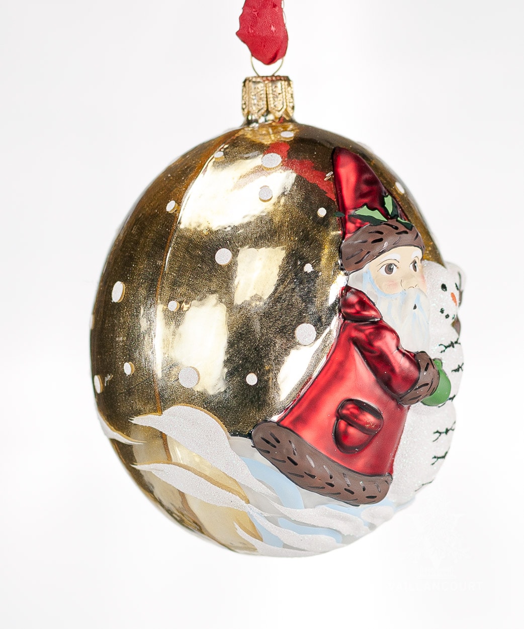 Mouth-blown, hand-painted Polish glass ornament in a oval shape featuring Santa with a snowman on a gold background.
