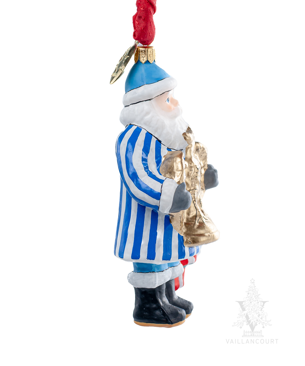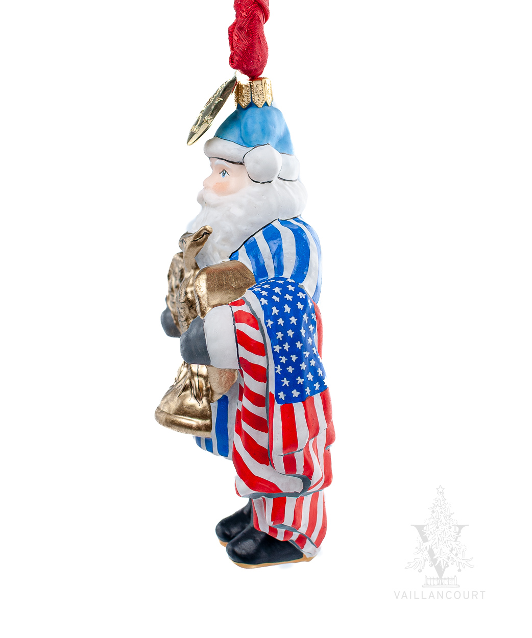 Celebrate America’s Semiquincentennial with the American Santa with Eagle ornament (VFA Nr. OR26508), a vibrant symbol of national pride crafted in blown glass by skilled artisans in Poland. Designed by Judi Vaillancourt, this limited-edition ornament features Santa in a blue-and-white striped coat, proudly clutching a radiant golden eagle—a timeless emblem of American strength and resolve. Draped in a flowing American flag and painted with striking detail, this collectible honors the spirit of 1776 while showcasing the Old World craftsmanship that brings Judi’s patriotic vision to life.