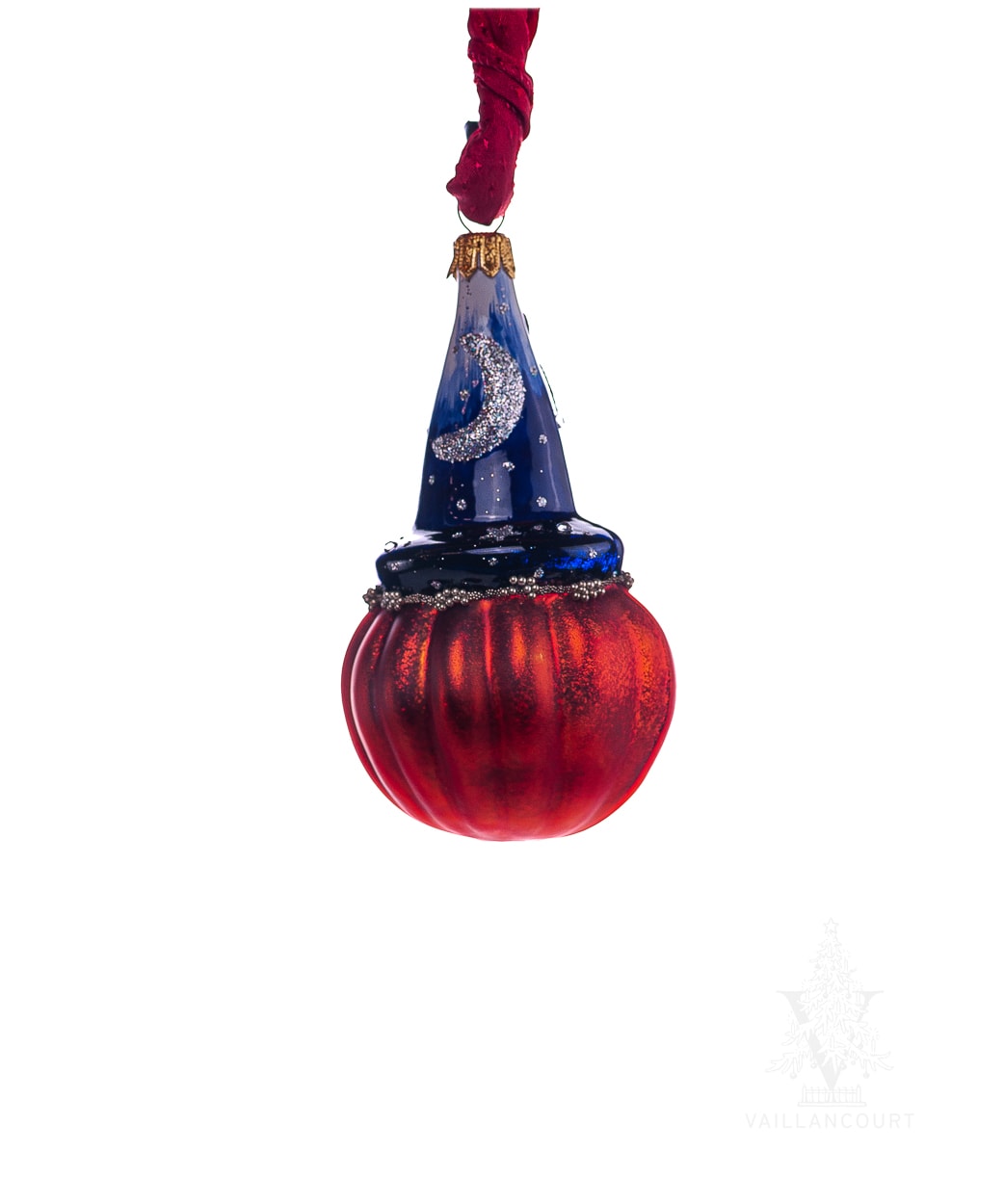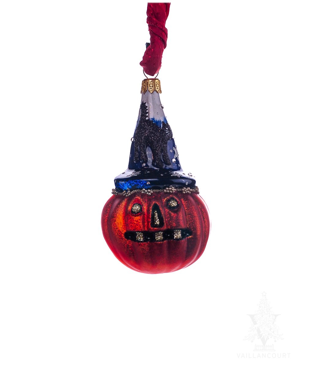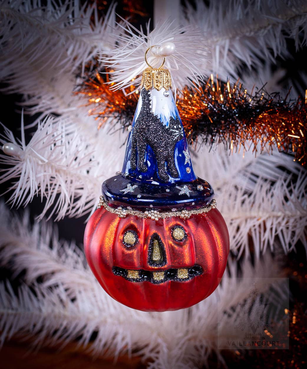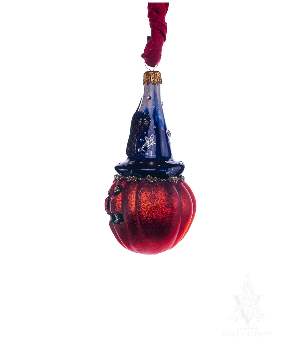 Based on the popular Jack O’Lantern with Witch Hat chalkware piece created in 1998, this ornament was created for those looking to add to their Halloween decorations with a touch of Vaillancourt. Mouth blown and hand painted, this halloween pumpkin is unique: it’s glittered from the inside to create a matte finish with depth unprecedented with ornaments. The hat’s enameled-like finish brings out the detail of the blues behind the black glimmer cat. Decorated with gold beading and crystal stars, you may want to hang this ornament up for Halloween and keep it through Christmas!